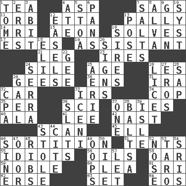 ACROSS 1. Afternoon social gathering 4. Viper 7. Sinks 11. Globe 12. Singer James 13. Chummy 14. Medical imaging device (abbr.) 15. Period of immesurable duration 16. Finds the solution 17. _____ Park, CO 19. Helper 21. Part of a journey 23. Angers 24. Drop; flow; fall 25. Mature 26. French article 29. Honkers 30. Followers of ems 31. Retirement account (abbr.) 32. Auto 33. Big collection agency 34. Police officer (slang) 35. For each 36. _-fi 37. Off-Broadway awards 40. According to 41. Area sheltered from the wind 42. Political cartoonist Thomas 43. Examine hastily 45. Pipe bend 46. Making a chance decision by using lots 51. Portable shelters 55. Foolish or stupid persons 56. Lubricates 58. Boat paddle 59. Having high moral qualities 60. Entreaty 61. _ Lanka 62. Celtic language 63. Put into a specified state 64. Greek goddess of the dawn DOWN 1. Heavy book 2. Blunders 3. "This won't hurt ____!" 4. Had dinner 5. Portico 6. Zero-star reviews 7. Table seasonings 8. Inventor's middle name 9. Small, secluded valley 10. System (abbr.) 12. Artist's stands 13. Airs 16. Begets 18. Writer Wiesel 20. Signals 22. Unit of force equal to gravity 24. Father Junipero _ 25. Nest on high 26. It is permitted: Lat. 27. Greek god of love 28. Plant excrement 29. Highlander 32. Tax preparer (abbr.) 33. Ancient Celtic tribe of eastern Britain 36. Narrow boards 37. Single 38. Greek mezzo-soprano Agnes 39. Small island 43. Took without asking 44. Quote 46. Trig term 47. Aroma 48. Chest bones 49. I made a mistake 50. Mediterranean tributary 52. Olfactory organ 53. Edible starchy tuberous root 54. Indian titles of respect 57. Allow