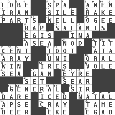 ACROSS 1. Ear part 5. Health resort 8. So be it 12. SW Asia republic 13. Filth; sediment 15. Immoral or dissolute person 16. Components 18. Water source 19. Double curve, resembling the letter S 20. Strike 22. Deli grouping 24. The front part of a cuirass 26. _ tizzy (2 wds.) 27. Toward the sea 28. Allow head to fall sleepily 29. Teat (slang) 32. Penny 35. A blast of a horn 37. "One Day ___ Time" 38. Like ___ of sunshine 39. Single; one (prefix) 40. Of the mouth 41. Victory 42. Angers 43. Short-tailed, large-bodied rat 44. Ocean 45. Separate the seeds from cotton 46. Jane of fiction 49. Arrange properly for use 50. Singe 51. Commissioned military rank 55. Title for a knight 56. Have the gumption 57. On the rocks 59. Relating to or accompanying birth 63. Domed church section 64. Supercomputer manufacturer 65. Docile 66. Fermented drink made from hops 67. Make supply last 68. Mild oath DOWN 1. Mouth edge 2. Mouth or opening 3. Oblong piece of solid material 4. Plea 5. Compass dir. 6. Sliced desserts 7. Silent film actress Nazimova 8. Odor 9. Wise men 10. Supplements with great effort 11. Born 14. American author Paul (1891-1958) 17. Sinks 21. Sliced dessert 23. Also 25. Titan orbits this 28. Annoying sounds 29. Pacific island yam 30. Slanted text style (abbr.) 31. Lie 32. Crow sounds 33. One of the Great Lakes 34. Nanny 36. Single 40. Make much ado about nothing 42. Of or pertaining to medicine 45. Unit of force equal to gravity 47. Consenting reply 48. Water falling in drops from the sky 49. Contemptuous expression 51. Yawn 52. Celtic language 53. 1/640 square mile 54. Path through which fluid escapes 56. Apply (a substance) by light strokes 58. Color 60. Label 61. Nursemaid (var.) 62. Directed