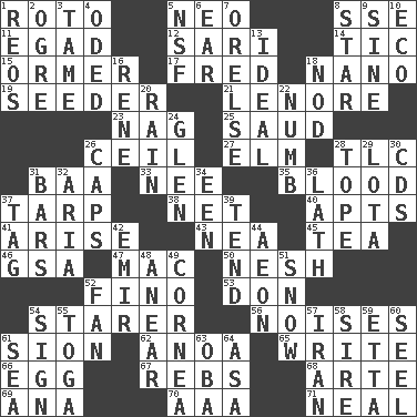 ACROSS 1. Printing process, for short 5. Modern: prefix 8. Compass dir. 11. Mild oath 12. Indian skirt 14. Nervous spasm 15. Abalone 17. Flintstone 18. Billionth: prefix 19. Sowing specialist 21. Poe poem 23. Tired old horse 25. Saudi Arabian king (1953-1964) 26. To provide with a ceiling 27. Shade tree 28. Affectionate concern, for short 31. Sound made by sheep 33. Born 35. Vital fluid 37. Canvas cover 38. Remaining after all deductions 40. Flats, for short 41. Ascend 43. Teachers' org. 45. Beverage made from leaves 46. Girls' org. (abbr.) 47. Apple computer (short form) 50. Soft 52. A pale, very dry sherry 53. Spanish title 54. A viewer who gazes fixedly 56. Annoying sounds 61. The Jewish people; Israel 62. Small Philippine buffalo 65. Compose 66. Ovum 67. Confederate soldiers (slang) 68. Johnson of "Laugh-In" 69. Santa ___, CA 70. Auto club (abbr.) 71. Actress Patricia DOWN 1. Vintage cars 2. Legendary monster 3. Not wild 4. Wrote a lyric poem 5. Overdraft (abbr.) 6. Hearing organ 7. Threatening words 8. Play the lead 9. Trig term 10. Environmental prefix 13. Standard of perfection 16. French philosopher Descartes 18. Dreamland 20. Water falling in drops from the sky 22. Unfeeling 24. Small, secluded valley 26. Smile enhancers 28. Drink excessively 29. Globular water bottle used in Asia 30. Music discs 31. Oblong pieces of solid material 32. Roberta Peters solo 34. Car or cant ending 36. Thin strip of wood or metal 37. Label 39. Watch over 42. Independent ruler or chieftain 44. Period of immesurable duration 48. Approach 49. Pupil covering 51. Overwhelm 52. Avid follower 54. Signal 55. Ancient Roman robe 57. SW Asia republic 58. Male parent of an animal 59. Singer James 60. Sew up the eyelids of hawks and falcons 61. Ocean 63. Chief or king in Benin or Nigeria 64. White ___ sheet