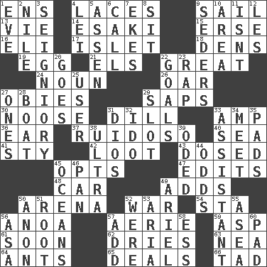 ACROSS 1. Followers of ems 4. Shoestrings 9. Travel by water 13. Compete 14. 1973 Nobel Price Winner (Physics) Leo 15. Celtic language 16. Connecticut Ivy Leaguer 17. Small island 18. Lairs 19. Oval reproductive body of a fowl 21. Raised railways 22. Relatively large 24. Part of speech 26. Boat paddle 27. Off-Broadway awards 29. Plant excrements 30. Trap for birds or small mammals 31. Deli pickle 33. Electrical Unit 36. Hearing organ 37. Boisterous (Brazilian Portuguese) 40. Ocean 41. Filthy place 42. Spoils 43. Administered medicine 45. Elects 47. Proofreads 48. Auto 49. Does sums 50. Sports stadium 52. Armed conflict 54. R.R. building 56. Small Philippine buffalo 57. Nest on high 59. Viper 61. Within a short period 62. Frees from moisture 63. Teachers' org. 64. Pismires 65. Allots cards 66. Small amount or degree DOWN 1. Night before a holiday 2. The longest river in the world 3. Signiory (variant) 4. Luau accessory 5. NE Netherlands city 6. Give a ring to 7. Supplements with great effort 8. Be seated 9. Spring feasts 10. Length times width 11. Is not 12. French article 20. Travels 22. Finish lines 23. Hit sharply and swiftly 25. One who makes use of a thing 27. Singles 28. Water vessel 29. Groove 31. "Vaya con ____" 32. Wedding promise 33. Aide 34. Rendezvous 35. Writing tablets 38. Extreme 39. Wrote a lyric poem 44. Probability 45. Seas 46. Baking dish 49. Satellite of Uranus 50. Soon (poet.) 51. Carrot, for example 52. We are 53. Operatic vocal solo 55. At sea 56. White ___ sheet 57. Find the sum of 58. Curvy letter 60. Groovy apt.