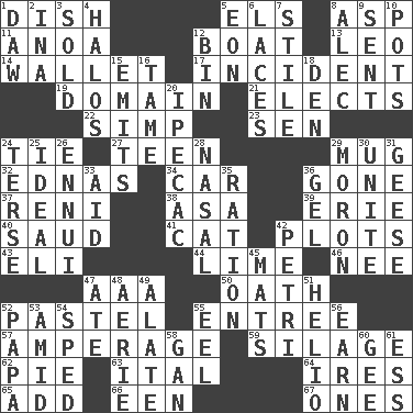 ACROSS 1. Food container 5. Raised railways 8. Viper 11. Small Philippine buffalo 12. Water vessel 13. Lion 14. Place for singles 17. Happening 19. Realm 21. Opts 22. Simple or foolish person 23. Elected rep. 24. Neckwear 27. Adolescent 29. Java container 32. Ferber et al. 34. 4-wheeled motor vehicle 36. Went 37. Painter Guido (1575-1642) 38. White ___ sheet 39. 4th largest of the Great Lakes 40. Saudi Arabian king (1953-1964) 41. Feline 42. Schemes 43. Connecticut Ivy Leaguer 44. Citrus frut 46. Born 47. Auto club (abbr.) 50. Pledge 52. Soft color 55. Main course 57. Electrical Measurement 59. Fodder prepared in a silo 62. Sliced dessert 63. Slanted text style (abbr.) 64. Angers 65. Increase 66. Car or cant ending 67. Singles DOWN 1. Simpleton 2. _ tizzy (2 wds.) 3. Disposed of to a purchaser 4. Auras 5. A really long time 6. Shoestrings 7. Vertical member of a panel or frame 8. Actor Baldwin 9. Transmitted 10. Cooking vessels 12. Storage container 15. Sends forth 16. Not wild 18. Lair 20. Medicinal drug used to evoke vomiting 24. Laconic 25. Perfect 26. World-weariness 28. Relating to the nose 29. Person of subnormal intelligence 30. Join together 31. Honkers 33. Help 35. Food allowance for one day 36. Set 42. _ dish (used to culture cells) 45. Floor protectors 47. Had dinner 48. Nest on high 49. Having winglike extensions 51. Sun: prefix 52. Dad 53. Among 54. Drove too fast 55. Snakelike fish 56. Merit 58. Separate the seeds from cotton 60. Turn to the right 61. Curvy letter