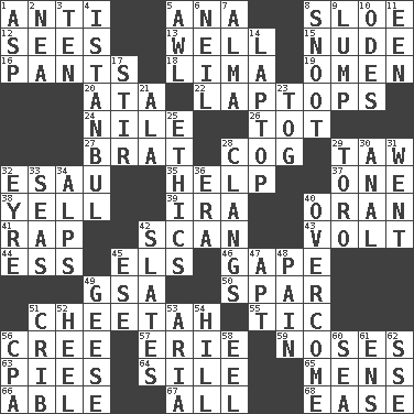 ACROSS 1. Opposed to 5. Santa ___, CA 8. _ gin 12. Observes 13. Not ill 15. Unadorned 16. Leg coverings 18. Pale green bean 19. Presage 20. "One Day ___ Time" 22. Portable computers 24. "Death on the ____" 26. Small child 27. Naughty child 28. Gear tooth 29. The 23rd letter of the Hebrew alphabet 32. He sold his birthright 35. Aid 37. Single 38. Shout 39. Retirement account (abbr.) 40. NW Algerian seaport 41. Reproach for some lapse or misdeed 42. Skim 43. Electrical Unit 44. Curvy letter 45. Raised railways 46. Open wide 49. Girls' org. (abbr.) 50. Practice fight 51. Leopard's kin 55. Nervous spasm 56. Algonquian 57. 4th largest of the Great Lakes 59. Olfactory organs 63. Sliced desserts 64. Filth; sediment 65. Not women's 66. Competent 67. Everything 68. Relaxation DOWN 1. Cleo's killer 2. Teachers' org. 3. Nine, plus one 4. Byzantium, centuries later 5. Leather borer 6. Famous astronaut Armstrong 7. _ mater 8. Snout, nose 9. Mass 10. Lyric poems 11. Car or cant ending 14. Portable computer 17. Use a swizzle stick 21. Chicken ___ king 23. Coat; cloak 25. Principles of right and wrong 28. Rings loudly 29. "Corrida" creature 30. Of or related to the anus 31. Left 32. Jane of fiction 33. Oceans 34. High mountains 36. Epoch 40. Conquer 42. Chalkboards 45. Compass dir. 47. Fitting 48. Ache 49. Honkers 51. Baby bed with high sides 52. The bottom of a shoe or boot 53. Roberta Peters solo 54. Land elevation 56. Accounting whiz (abbr.) 58. Snakelike fish 60. Ocean 61. Followers of ems 62. Compass dir.