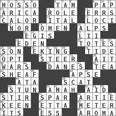 ACROSS 1. With motion or animation 6. Scottish cap 9. Infant food 12. N. Chile seaport 13. Hero or heavy, e.g. 14. Blunders 15. Bodily heat indicating an inflammation 16. Slanted text style (abbr.) 17. Event scenes 18. And not 19. Sign of something about to happen 20. High mountains 21. The front part of a cuirass 23. Cards in a Roman deck? 24. Locale of original sin 25. Hauls 28. Manchild 30. Supplementing with great effort 34. Periodic rise and fall of the sea level 35. Choose 36. Bull 38. Small island 39. Armed conflicts 41. Natives or inhabitants of Denmark 43. Afternoon social gathering 44. To gather and bind into a bundle 46. Domed church section 48. "One Day ___ Time" 49. Get outta here! 50. Surprise greatly 51. Wet nurse 53. Help 56. Move through with a circular motion 57. Practice fight 58. Nick name for Arthur 60. Peachy ____! 61. Singer James 62. Distance measurement 63. ___ a Wonderful Life 64. Double-curved letter 65. Scent DOWN 1. Apple computer (short form) 2. Northwest Algerian city 3. Grain storage tower 4. Tallied 5. Rowing implement 6. Lug 7. Actor Alda or Thicke 8. Cartoonist voice _ Blanc 9. Appease 10. Curves 11. Air pressure measure (abbr.) 13. Basketball hoops 14. American author Paul (1891-1958) 19. Pig sounds 20. The first octave above the treble staff 22. Turn to the right 24. Pleas 26. Singer Brickell 27. Stalk of a moss capsule 28. Sty mamas 29. Brightly colored fish 31. It would 32. Teachers' org. 33. Commissioned military rank (abbr.) 37. Arrive at 40. Titan orbits this 42. Health resort 45. Avid follower 47. A viewer who gazes fixedly 49. "Two Mules for Sister ____" 50. Proofreading order 51. Flats, for short 52. Floor coverings 54. "Tell ____ the Marines!" 55. South Vietnam president (1954) 56. What Jean-Claude Killy likes to do 57. Perceive with the eye 58. Wet nurse (var.) 59. Period