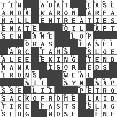 ACROSS 1. Metal container 4. Blind as ____ 8. Comfort 12. Small Philippine buffalo 14. Make _____ (do battle with) 16. Type of rug 17. Shopping center 18. Pleas 20. Related on the mother's side 22. Lubricate 23. Fitting 24. Elected rep. 25. One (Scot) 28. Chop off 30. Mouths or openings 31. Artist's stand 35. Curve 37. Scottish caps 40. A type of plum 41. Toward shelter 42. Supplementing with great effort 44. Look after 45. Grandmother 46. Composer Stravinsky 47. Begley and Asner 48. Removes the wrinkles 50. Welt 52. Be seated 54. Symbol (abbr.) 55. Plant excrement 58. Compass dir. 61. Cards in a Roman deck? 63. Stone: prefix 65. Italian handbag shop? 70. Put down 71. Hoop that covers a wheel 72. Goes without food and/or water 73. Volcanic refuse 74. A hard, heavy blow 75. Characteristic smell of wine 76. Compass dir. DOWN 1. Domesticates 2. Lacking in sense or substance 3. Pitcher Ryan 4. Deep reverence 5. Prohibit 6. Nonscientific branch of learning 7. "Corrida" creature 8. Ingest 9. Operatic vocal solo 10. Ooze 11. Compass direction 13. Keyboard modifier key 15. Famous astronaut Armstrong 19. _ vera 21. Ewer handle 26. Nathan's nickname 27. 1973 Nobel Price Winner (Physics) Leo 29. Soft color 30. Seas 32. Downhill vehicle 33. Immeasurably long periods of time 34. Directed 35. Having or resembling wings 36. Former U.S. Attorney General Janet 38. Russian fighter aircraft 39. Overwhelms 41. Cuckoo 43. Jennifer or Joel 49. Grain storage tower 51. Electrical Unit 53. Small quarrel 55. Showing deterioration from age 56. Believer in; advocate of (suffix) 57. Plash 58. Fast planes 59. Travel by water 60. Shade of tan 62. SW Asia republic 64. Raised railways 66. Cask 67. Bear (Spanish) 68. Mountains (abbr.) 69. Compass dir.