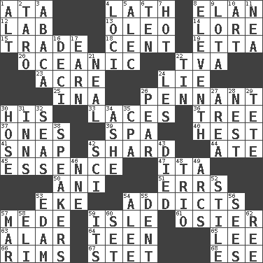ACROSS 1. _ moment's notice (2 wds.) 4. Thin strip of wood or metal 8. Enthusiasm 12. Experiment locale 13. Margarine 14. Old wives' tales, e.g. 15. Buy and sell 18. Penny 19. Singer James 20. Pertaining to the sea 22. Federal power corp. 23. Measure of real estate 24. Whopper 25. _ tizzy (2 wds.) 26. Pre-World Series prize 30. Part of HMS, perhaps 33. Shoestrings 36. Relationship diagram 37. Washington bills 39. Health resort 40. Behest 41. Fastener 42. Broken piece 44. Had dinner 45. Substance 47. Call ___ day 50. Black tropical American cuckoo 51. Blunders 53. Supplement with great effort 54. Inveterate users 57. Ancient Persian 59. Small island 61. Flexible twig of a willow tree 63. Having or resembling wings 64. Adolescent 65. Area sheltered from the wind 66. Basketball hoops 67. Proofreading order 68. Compass dir. DOWN 1. Keyboard modifier key 2. Edible starchy tuberous root 3. Phillipine bananalike plant 4. Locales 5. Actor Baldwin 6. Nine, plus one 7. Being at a high temperature 8. Veterans Day date 9. Globular water bottle used in Asia 10. Tate display 11. Teachers' org. 16. Tenth: prefix 17. Merit 21. Anneal 22. Metal container 24. French article 26. Lightbulb-shaped fruit 27. Type of rug 28. A home for chicks 29. Wig 30. Flexible conduit 31. Taverns 32. Oceans 34. American tennis player Robert 35. Accounting whiz (abbr.) 38. Orators 42. _-fi 43. Passed on 46. Compass dir. 48. Musical group of three 49. Curves 52. Vertical member of a panel or frame 53. Dutch treat 54. Toward shelter 55. Undesirable depression on a surface 56. Observes 57. Make imperfect 58. Connecticut Ivy Leaguer 59. ___ a Wonderful Life 60. Arrange properly for use 62. Portuguese money of account (variant)