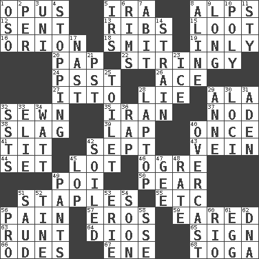 ACROSS 1. Musical composition 5. Retirement account (abbr.) 8. High mountains 12. Transmitted 13. Teases 15. Spoils 16. Greek mythologigal hunter 18. Stricken, poetically 19. In an inward manner 20. Infant food 22. Slender, wiry 24. Inconspicuous attention getter 26. Adept person 27. "Tell ____ the Marines!" 28. Whopper 29. According to 32. Stitched 35. SW Asia republic 37. Dreamland 38. Volcanic refuse 39. Pet locale 40. At one time in the past 41. Teat (slang) 42. Back-to-school mo. 43. Distinctive style or manner 44. Arrange properly for use 45. Car dealer's back yard 46. Legendary monster 49. Luau course 50. Lightbulb-shaped fruit 51. Paper fasteners 55. And so on (abbr.) 56. Ache 57. Greek god of love 59. Having ears or earlike features 63. The smallest animal of a litter 64. "Vaya con ____" 65. Omen 66. Lyric poems 67. Compass dir. 68. Ancient Roman robe DOWN 1. Bear (Spanish) 2. For each 3. Single; one (prefix) 4. Closing up, plugging up 5. Big collection agency 6. Basketball hoops 7. "This won't hurt ____!" 8. Place in a line 9. Protracted 10. More than one (prefix) 11. Filthy place 14. Put through a sieve 17. Political cartoonist Thomas 21. Pacific Standard Time (abbr.) 23. Frozen water 25. Rest room 28. Portable computer 29. Queen of England 1702-14 30. Locales 31. An important port of Yemen 32. Fast planes 33. Writer Wiesel 34. Electrical Unit 36. Strike 40. Cloudy 42. Dirtied 45. Trim (branches) 47. Turn to the right 48. Pace 49. Leg coverings 51. Saudi Arabian king (1953-1964) 52. Prong on a fork 53. 4th largest of the Great Lakes 54. Within a short period 56. Adept person 58. Compass dir. 60. River (Sp.) 61. Ovum 62. Heredity factor (abbr.)