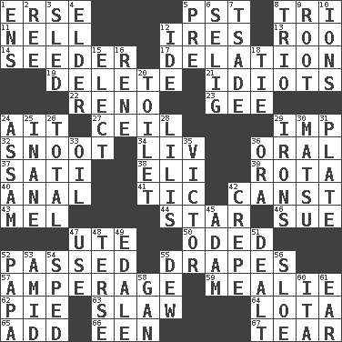 ACROSS 1. Celtic language 5. Pacific Standard Time (abbr.) 8. Three (prefix) 11. 1994 drama film starring Jodie Foster 12. Angers 13. Friend of Pooh 14. Sowing specialist 17. Accusation by an informer 19. Erase 21. Foolish or stupid persons 22. Western Nevada city 23. Unit of force equal to gravity 24. Small island 27. To provide with a ceiling 29. Mischievous child 32. Snout, nose 34. 54 in ancient Rome 36. Relating to the mouth 37. Suttee (variant) 38. Biblical high priest 39. Roll call or roster of names 40. Of or related to the anus 41. Nervous spasm 42. 2nd pers. sing. pres. of can (arch.) 43. Cartoonist voice _ Blanc 44. Play the lead 46. Take to court 47. Shoshoni 50. Wrote a lyric poem 52. Went by 55. Window treatments 57. Electrical Measurement 59. Ear of corn 62. Sliced dessert 63. Cole _ (cabbage dish) 64. Globular water bottle used in Asia 65. Increase 66. Car or cant ending 67. Lacerate DOWN 1. Followers of ems 2. To sift 3. Downhill vehicle 4. A person who is older than you are 5. Before (prefix) 6. Major League Baseball Commissioner Bud 7. Sadhe (variant) 8. Musical group of three 9. Carrot, for example 10. Charged atoms 12. Binary compound 15. Opt 16. French philosopher Descartes 18. Neckwear 20. Bathroom 24. Indian state 25. Silly 26. "_____ Recall" 28. Ms. Damita and namesakes 29. Removes the wrinkles 30. Taiwanese island in East China Sea 31. Food holder 33. Lubricate 35. Winning man's name 36. Mouth or opening 42. Streamer paper 45. First man 47. Purpose 48. Laconic 49. Peak District village in England 51. Started a card game 52. Dad 53. Among 54. Drove too fast 55. Morning condensation 56. _ gin 58. Separate the seeds from cotton 60. Call ___ day 61. Ewer handle