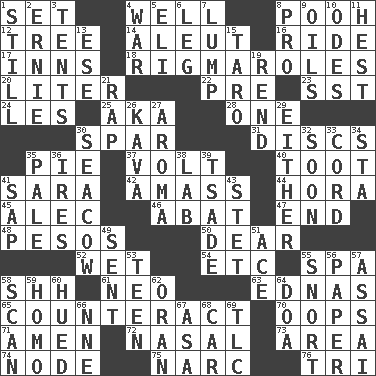 ACROSS 1. Put into a specified state 4. Water source 8. "Silly old bear" 12. Relationship diagram 14. Eskimo relative 16. Travel on an animal 17. Taverns 18. Complicated, petty procedures 20. 61 cubic inches 22. Before (prefix) 23. Fast jet (abbr.) 24. French article 25. Alias (abbr.) 28. Single 30. Coast Guard woman 31. Plates 35. Sliced dessert 37. Electrical Unit 40. A blast of a horn 41. "Two Mules for Sister ____" 42. Collect or gather 44. Israeli folk dance 45. Actor Baldwin 46. Blind as ____ 47. Conclusion 48. Mexican monetary units 50. Letter starter 52. Soggy 54. And so on (abbr.) 55. Health resort 58. Quiet! 61. Modern: prefix 63. Ferber et al. 65. Frustrate 70. I made a mistake 71. So be it 72. Relating to the nose 73. Length times width 74. Thickened enlargement 75. Drug cop 76. Three (prefix) DOWN 1. Free from disturbance or agitation 2. Bert's buddy 3. Portable shelters 4. Armed conflict 5. Connecticut Ivy Leaguer 6. Part of a journey 7. Mass 8. Adept person 9. Petroleums 10. Lyric poems 11. Command 13. Compass dir. 15. Pacific island yam 19. Tear apart 21. Strike 26. Polynesian shrub of the pepper family 27. Scent 29. One or the other 30. Manatee 32. Within a short period 33. Drawstring 34. R.R. building 35. Light colored 36. Angers 38. Experiment locale 39. Sadhe (variant) 41. Plant excrement 43. Proofreading order 49. Emitted 51. Adept person 53. Adolescent 55. Derisive sound 56. Some stationery 57. Slender Brazilian palm 58. Glance over 59. Like (prefix) 60. Became colored 62. Northwest Algerian city 64. ___ good deed 66. Compass dir. 67. White ___ sheet 68. Auto 69. Affectionate concern, for short