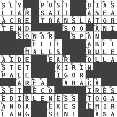 ACROSS 1. Wily 4. Mail 8. Prejudice 12. One who doesn't tell the truth 14. Suttee (variant) 15. Toward the sea 16. Land measure 17. Interpreter 20. Watch over 21. "Barney Miller" actor Jack 22. Black tropical American cuckoo 23. Echolocation 27. Connect, as a bridge 29. Writer Wiesel 31. Collude with 34. Shopping centers 35. Governing power 36. Assistant 39. Hearing organ 41. Spanish pot 42. Proofreading order 43. Japanese brewing company 46. Diluted with white 47. Russian composer Stravinsky 48. Length times width 51. Phillipine bananalike plant 54. Arrange properly for use 56. Environmental prefix 58. Angers 61. The property of being fit to eat 66. Ancient Roman robe 67. Small Philippine buffalo 68. Makes supply last 69. Arab leader 70. Austrian-born American filmmaker Fritz 71. Transmitted 72. White ___ sheet DOWN 1. Narrow board 2. Louse (plural) 3. Tall tales 4. Pacific Standard Time (abbr.) 5. Rowing implement 6. R.R. building 7. Canisters 8. Sound made by sheep 9. Byzantium, centuries later 10. A really long time 11. Indian skirt 13. Make new 18. Distress signal 19. Chop off 24. Teachers' org. 25. 100% 26. Cause heat under the collar 28. Composer Copland 30. 1973 Nobel Price Winner (Physics) Leo 32. Pipe bend 33. Afternoon social gathering 34. Distance measurement 36. Viper 37. Call ___ day 38. Conveyance 40. Port city in Latvia 44. Director Reiner 45. Retirement account (abbr.) 49. Snakelike fish 50. Adept person 52. Quote 53. Scent 54. Lick closed 55. Pulitzer Prize-winning author Ferber 57. Singles 59. Armor plate that protects the chest 60. "Two Mules for Sister ____" 62. Paper or plastic container 63. Supplement with great effort 64. Elected rep. 65. Fast jet (abbr.)