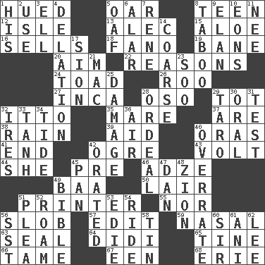 ACROSS 1. Took on color 5. Boat paddle 8. Adolescent 12. Capri or Wight 13. Actor Baldwin 15. Medicinal plant 16. Exchanges for money 18. Papal veil 19. Object of repulsion 20. Direct toward a target or goal 22. Thinks logically 24. Frog relative 26. Friend of Pooh 27. South American Indian 28. Bear (Spanish) 29. Small child 32. "Tell ____ the Marines!" 35. Female horse 37. "We ___ not amused" (Victoria) 38. Water falling in drops from the sky 39. Help 40. Mouths or openings 41. Conclusion 42. Legendary monster 43. Electrical Unit 44. A female animal or person 45. Before (prefix) 46. Axlike tool, used for shaping wood 49. Sound made by sheep 50. Den 51. Hard copy producer 55. And not 56. Oscar Madison type 57. Prepare for publication 59. Relating to the nose 63. Lick closed 64. "You Light Up My Life" star Conn 65. Prong on a fork 66. Docile 67. Car or cant ending 68. One of the Great Lakes DOWN 1. Part of HMS, perhaps 2. Purpose 3. Pipe bend 4. Accusation by an informer 5. Clumsy lout 6. Having or resembling wings 7. French philosopher Descartes 8. Off limits 9. Style 10. Immeasurably long periods of time 11. Born 14. Unrefined 17. The Jewish people; Israel 21. Big _ 23. "Barney Miller" actor Jack 25. Break 28. Severe or trying experience 29. Pacific island yam 30. Taken by mouth 31. Trial 32. Angers 33. Hyperbolic tangent 34. Periodic rise and fall of the sea level 36. Wind 40. Make much ado about nothing 42. Spoke pompously 45. Baking dish 47. One of the 12 tribes of Israel 48. The Jewish people; Israel 49. The Good Book 51. Entreaty 52. Wander 53. Singer Brickell 54. Travel on an animal 56. Fast jet (abbr.) 58. Shallow baking pan 60. Title for a knight 61. Black tropical American cuckoo 62. Area sheltered from the wind
