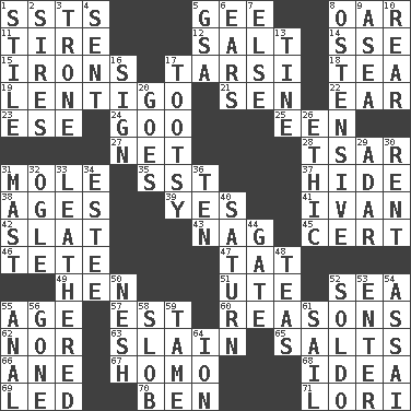 ACROSS 1. Fast planes 5. Unit of force equal to gravity 8. Boat paddle 11. Hoop that covers a wheel 12. Table seasoning 14. Compass dir. 15. Removes the wrinkles 17. Tarsus (plural) 18. Beverage made from leaves 19. Small, flat, pigmented spot on the skin 21. Elected rep. 22. Ewer handle 23. Compass dir. 24. Thick or sticky substance 25. Car or cant ending 27. Fish or hair follower 28. Russian ruler of old 31. Undercover agent 35. Fast jet (abbr.) 37. Flintstone garb 38. Matures 39. It is so 41. "Terrible" tsar 42. Narrow board 43. Tired old horse 45. Sure thing 46. False hair 47. Make lace 49. Layer 51. Shoshoni 52. Ocean 55. Personal question 57. Eastern Standard Time (abbr.) 60. Thinks logically 62. And not 63. Killed 65. Table seasonings 66. A saturated hydrocarbon 67. Like (prefix) 68. The content of cognition 69. Directed 70. Benjamin's nick name 71. Australian parrot (variant) DOWN 1. Vertical member of a panel or frame 2. Fathers 3. Heavy duty weighing machine 4. Transmitted 5. Girls' org. (abbr.) 6. Hearing organs 7. Otherwise 8. Clearly or manifestly demonstrative 9. Toward the sea 10. Located in or toward the back 13. Prong on a fork 16. Omen 17. A girl or young woman (variant) 20. Moves 26. Principle of right and wrong 29. The sixth month of the Jewish calendar 30. Monthly bill 31. Vertical spar for supporting sails 32. Stare 33. Resembling or made to resemble leather 34. First name in cosmetics 36. Nine, plus one 40. Titan orbits this 44. Yard entry 48. Beverages made from leaves 50. Tender 52. Twentieth part of a lira 53. Keyboard key 54. Slender Brazilian palm 55. Of or related to the anus 56. Went 58. Oscar Madison type 59. Docile 61. Travel by water 64. Electrically charged atom