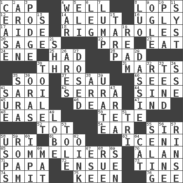 ACROSS 1. Head covering 4. Not ill 8. Chops off 12. Greek god of love 14. Eskimo relative 16. Repulsive 17. Helper 18. Frustrating wastes of time 20. Gurus 22. Before (prefix) 23. Erode 24. Compass dir. 25. Possessed 28. Groovy apt. 30. Through, poetically 31. Shops 35. "Barney Miller" actor Jack 37. Son of Isaac 40. Perceives with the eye 41. Indian skirt 42. Spanish missionary in California 44. Trig term 45. Mountain range 46. Letter starter 47. Working for oneself (abbr.) 48. Artist's stand 50. False hair 52. Small child 54. Hearing organ 55. Title for a knight 58. RI univ. 61. Sometimes accompanies a hiss 63. Ancient Celtic tribe of eastern Britain 65. Wine waiters 70. Actor Alda or Thicke 71. Dad 72. Follow as a consequence or result 73. Canisters 74. Stricken, poetically 75. Peachy ____! 76. Turn to the right DOWN 1. Desist 2. Believer in; advocate of (suffix) 3. Porridge 4. Armed conflict 5. Connecticut Ivy Leaguer 6. Part of a journey 7. Mass 8. Nilotic language 9. Stare 10. Entreaty 11. System (abbr.) 13. Observe 15. Canvas cover 19. 480, 500 or 516 sheets of paper 21. Quiet! 26. Ancient Greek god of war 27. Administered medicine 29. Hyrax 30. Bathroom plumbing fixture 32. It's straight from the horse's mouth 33. Look after 34. Compass dir. 35. "Two Mules for Sister ____" 36. Mouths or openings 38. "We ___ not amused" (Victoria) 39. A salt of uric acid 41. Institute legal proceedings 43. Type of rug 49. Ear part 51. Three (prefix) 53. Lacquered or enameled metalware 55. Former Milwaukee Brewers owner Bud 56. Empty; void 57. Wash lightly 58. United States Postal Service (abbr.) 59. Wander 60. Body of Kaffir warriors 62. Pig sound 64. Domesticated feline 66. Floor protector 67. Compass dir. 68. Regret 69. Elected rep.