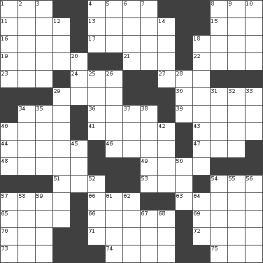 ACROSS 1. Infant food 4. Dutch treat 8. Make lace 11. Ancient Greek god of war 13. Echolocation 15. Chief or king in Benin or Nigeria 16. Trig term 17. 1973 Nobel Price Winner (Physics) Leo 18. Made supply last 19. Portable shelters 21. Part of a journey 22. Allows 23. Raised railways 24. Rowing implement 27. Frozen water 29. Southeast Asian peninsula 30. Baking chambers 34. Air blower 36. Sums up 39. Mexican monetary units 40. Mild oath, euphamism for damn 41. Intended 43. Nathan's nickname 44. Keyboard key 46. Scent 47. Third day of the wk. 48. Annoying sound 49. Ending for "Through" and "Enough" 51. "___ Little Indians" 53. Beverage made from leaves 54. Plant excrement 57. Cause heat under the collar 60. Had dinner 63. Arrive at 65. Enthusiastic 66. "The Thinker" sculptor 69. Von Bismarck 70. Scottish cap 71. Capital of Egypt 72. The Jewish people; Israel 73. Compass dir. 74. Letter starter 75. Compass dir. DOWN 1. Thick mixture 2. Satellite of Uranus 3. Actor Sean's family 4. Compass dir. 5. Two (Sp.) 6. Of or related to the anus 7. Cause to be 8. Casino tip 9. Collude with 10. Bits 12. Put into a specified state 14. Swiss mountan, "Queen of the Mountains" 18. Veterans Day date 20. Boy, to dad 25. First man 26. Cowboy competition 28. Police officer (slang) 29. Eaten 31. He sold his birthright 32. Short letter 33. Compass dir. 34. Papal veil 35. Opposed to 37. June honoree 38. Snout, nose 40. Lair 42. Loyal 45. To riddle 50. Slender fish 52. Drug cop 54. Smooth fabric 55. 13-14th century defensive garment 56. Give a jingle 57. Pace 58. _ the terrible 59. Citrus frut 61. Frog relative 62. Singer Brickell 64. Greek goddess of the dawn 67. Retirement account (abbr.) 68. And not