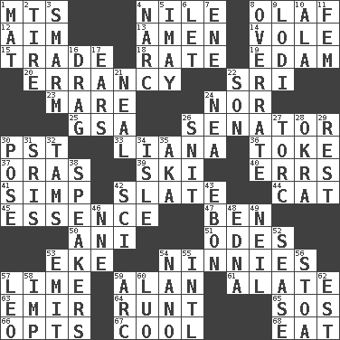 ACROSS 1. Mountains (abbr.) 4. The longest river in the world 8. Norwegian king 12. Direct toward a target or goal 13. So be it 14. Grand slam 15. Swap 18. Pace 19. Dutch treat 20. Tendancy to err 22. Indian title of respect (Mr.) 23. Female horse 24. Not either 25. Girls' org. (abbr.) 26. Legislator 30. Pacific Standard Time (abbr.) 33. Woody, climbing, usually tropical plant 36. Casino tip 37. Mouths or openings 39. What Jean-Claude Killy likes to do 40. Blunders 41. Simple or foolish person 42. Chalkboard 44. Feline 45. Center 47. Benjamin's nick name 50. Black tropical American cuckoo 51. Lyric poems 53. Make supply last 54. Fools 57. Citrus frut 59. Actor Alda or Thicke 61. Having winglike extensions 63. Arab leader 64. Undersized animal 65. Distress signal 66. Chooses 67. Calm and collected 68. Erode DOWN 1. Floor protector 2. Become fatigued 3. Excessive but superficial compliments 4. Drug cop 5. "If ____ say so..." 6. Allow 7. Compass dir. 8. Make much ado about nothing 9. Farming town in central California 10. Insect wing 11. Opposite of masc. 16. To trail on the ground 17. Hearing organs 21. Actress Patricia 22. Male child 24. Teachers' org. 26. In a ____ (agitated or irritated) 27. Torque (variant) 28. Gumbo ingredient 29. Repose 30. Airs 31. Indian titles of respect 32. Scottish caps 34. Capri or Wight 35. Alias (abbr.) 38. Orators 42. _-fi 43. Inky black, to poets 46. Compass dir. 48. Pulitzer Prize-winning author Ferber 49. Famous astronaut Armstrong 52. Gospel singer Marvin 53. Give off 54. Billionth: prefix 55. International (abbr.) 56. Portico 57. Lion 58. Mischievous child 59. Curve 60. Nilotic language 62. Eastern Standard Time (abbr.)