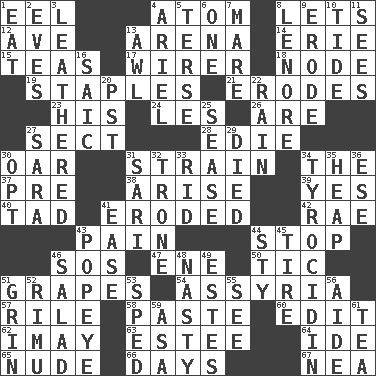 ACROSS 1. Snakelike fish 4. Smallest unit of an element 8. Allows 12. "___ Maria" 13. Sports stadium 14. One of the Great Lakes 15. Afternoon social gatherings 17. One who wires 18. Thickened enlargement 19. Paper fasteners 21. Eats (away) 23. Part of HMS, perhaps 24. French article 26. "We ___ not amused" (Victoria) 27. Religious group 28. Singer Brickell 30. Boat paddle 31. Put through a sieve 34. Definite Article 37. Before (prefix) 38. Originate 39. Affirmative reply 40. Bit 41. Worn away 42. Actress Charlotte 43. Ache 44. Close up, plug up 46. Distress signal 47. Compass dir. 50. Nervous spasm 51. Raisin fruits 54. Nineveh was its capital 57. Cause heat under the collar 58. Thick mixture 60. Prepare for publication 62. "If ____ say so..." 63. First name in cosmetics 64. Binary compound 65. Naked 66. 24-hour periods 67. Teachers' org. DOWN 1. Erode 2. Nights before holidays 3. Tough but pliablecoriaceous 4. Satellite of Uranus 5. Laconic 6. Single 7. Female horse 8. Poe poem 9. Eat (away) 10. Event that recurs at intervals 11. Observes 13. Leather borer 16. Ketch in the Levant 20. Pacific Standard Time (abbr.) 22. Water falling in drops from the sky 25. Gospel singer Marvin 27. "Two Mules for Sister ____" 29. Passed on 30. Elect 31. Indian skirt 32. Marketplace scale 33. To free from 34. Polypeptide antibiotic 35. Pile 36. Compass dir. 41. Relaxation 43. Wimpy's pal 44. Filthy place 45. Hoop that covers a wheel 46. Vegetable dish 48. Offensive 49. _____ Park, CO 51. Broad smile 52. Tall New Zealand timber tree 53. Moved rapidly 55. Observe 56. Assistant 59. White ___ sheet 61. Afternoon social gathering