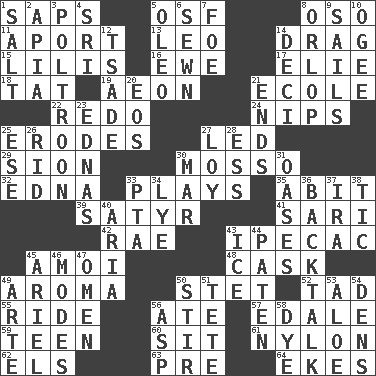 ACROSS 1. Plant excrements 5. Order of Saint Francis (abbr.) 8. Bear (Spanish) 11. To the left, to Queeg 13. Lion 14. To be drawn or hauled along 15. Ms. Damita and namesakes 16. She-sheep 17. Writer Wiesel 18. Make lace 19. A really long time 21. Learning spot: Fr. 22. Do over again 24. Cuts off 25. Eats (away) 27. Directed 29. The Jewish people; Israel 30. With motion or animation 32. Pulitzer Prize-winning author Ferber 33. Frolics 35. "This won't hurt ____!" 39. Man with strong sexual desires 41. Indian skirt 42. Actress Charlotte 43. Medicinal drug used to evoke vomiting 45. Mine, in Marseilles 48. Keg 49. Odor 50. Proofreading order 52. Small boy 55. Travel on or in a vehicle 56. Had dinner 57. Peak District village in England 59. Adolescent 60. Be seated 61. High-strength synthetic material 62. Raised railways 63. Before (prefix) 64. Supplements with great effort DOWN 1. Table seasoning 2. Capital of Western Samoa 3. Coward 4. _ Lanka 5. Butter sub 6. Stitched 7. Enemy 8. Lowest deck of a ship 9. Moves on water 10. Double curve, resembling the letter S 12. Sadhe (variant) 14. Tenth: prefix 20. Greek goddess of the dawn 21. Conclusions 23. Ferber et al. 25. Compass dir. 26. To free from 27. Myrna of the movies 28. Curvy letter 30. Make imperfect 31. Fertile tracts in a desert 33. Parent Teacher Association (abbr.) 34. Potassium hydroxide 36. Sass 37. Retirement account (abbr.) 38. Nervous spasm 40. Roberta Peters solo 43. Frozen water 44. Eucharist need 45. Satellite of Uranus 46. Methods 47. Presage 49. Johnson of "Laugh-In" 50. Use a spoon 51. False hair 53. Medicinal plant 54. Hiding places for outlaws 56. Cleo's killer 58. Color