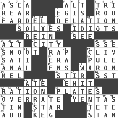 ACROSS 1. Toward the sea 5. The first octave above the treble staff 8. Three (prefix) 11. Posterior 12. The front part of a cuirass 13. Friend of Pooh 14. Burden 17. Accusation by an informer 19. Finds the solution 21. Foolish or stupid persons 22. It's straight from the horse's mouth 23. Perceive with the eye 24. Small island 27. Municipality 29. Compass dir. 32. Snob 34. Hit sharply and swiftly 36. 154 in Roman numerals 37. Suttee (variant) 38. Epoch 39. Whimper 40. Of or related to the anus 41. Followers of ems 42. Make _____ (do battle with) 43. Cartoonist voice _ Blanc 44. Move through with a circular motion 46. Fast jet (abbr.) 47. Had dinner 50. Give off 52. Food allowance for one day 55. Food holders 57. Make much ado about nothing 59. Gossips 62. Metal container 63. Play the lead 64. Wig 65. Increase 66. Barrel 67. Comedian Laurel of Laurel & Hardy DOWN 1. Sandy's bark 2. Ocean 3. Hearing organs 4. Zeal 5. Grow older 6. Ms. Damita and namesakes 7. Sadhe (variant) 8. Musical group of three 9. Carrot, for example 10. Charged atoms 12. Begley and Asner 15. Voters do this 16. 57 in ancient Rome 18. Neckwear 20. Main course 24. Indian state 25. Empty; void 26. Add up to 28. Tall tales 29. Disparaging remarks 30. Grain storage towers 31. Happening 33. Petroleum 35. Soft color 36. Accounting whiz (abbr.) 42. Compose 45. "If ____ say so..." 47. Wind 48. Cod relative 49. Maternal 51. Portable shelters 52. Roll call or roster of names 53. Enthusiastic 54. Watch over 55. For each 56. Proofreading order 58. Label 60. _ moment's notice (2 wds.) 61. Elected rep.