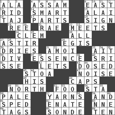 ACROSS 1. Insect wing 4. Indian state 9. Compass direction 13. To free from 14. Don Adams' spy role 15. Jai ____ 16. _ Mahal 17. Pieces 18. Omen 19. Portuguese money of account (variant) 21. Actress Charlotte 22. Confronts 24. Clement's nick name 26. Everything 27. Having gotten out of bed 29. The front part of a cuirass 30. Frees from moisture 31. Mine, in Marseilles 33. Small island 36. HTML Container Element 37. Core 40. Indian title of respect (Mr.) 41. Compass dir. 42. Allows 43. Administered medicine 45. Portico 47. Annoying sound 48. Part of HMS, perhaps 49. Balmoral and tarboosh 50. 0 degrees 52. Egg _ yung 54. R.R. building 56. Light colored 57. Tall tales 59. Also 61. Moved rapidly 62. Maternal 63. Compass dir. 64. Labels 65. Something which is sent 66. Nine, plus one DOWN 1. Nonscientific branch of learning 2. One who doesn't tell the truth 3. Descriptive word 4. Viper 5. Excessive but superficial compliments 6. "Two Mules for Sister ____" 7. Johnson of "Laugh-In" 8. Mountains (abbr.) 9. Artist's stands 10. Came down and settled, as after flight 11. Sinks 12. Metal container 20. Writer Wiesel 22. Mysterious quality of enchantment 23. Connecticut Ivy Leaguer 25. Celtic language 27. Sums up 28. Indian titles of respect 29. Immeasurably long periods of time 31. Toward the sea 32. Was introduced to 33. Helper 34. Angers 35. Periodic rise and fall of the sea level 38. Agitate, as a liquid 39. Pulitzer Prize-winning author Ferber 44. I made a mistake 45. Tears up 46. Teat (slang) 49. Continued (abbr.) 50. California wine valley 51. Cassini of fashion 52. Papal veil 53. NW Algerian seaport 55. Queen of England 1702-14 56. Pacific Standard Time (abbr.) 57. Affirmative reply 58. Observe 60. Lair