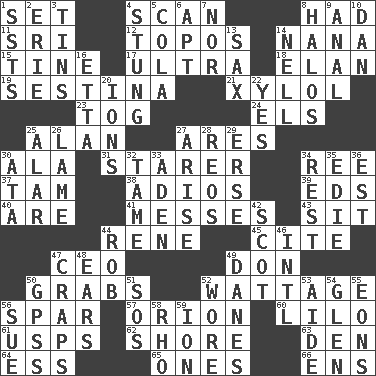 ACROSS 1. Arrange properly for use 4. Examine hastily 8. Possessed 11. _ Lanka 12. Traditional theme or motif 14. Grandmother 15. Prong on a fork 17. Extreme 18. Flair 19. French poetic form 21. Xylene (variant) 23. Coat; cloak 24. Raised railways 25. Actor Alda or Thicke 27. Ancient Greek god of war 30. Insect wing 31. A viewer who gazes fixedly 34. To sift 37. Scottish cap 38. Goodbye (Sp.) 39. Begley and Asner 40. "We ___ not amused" (Victoria) 41. Makes clutter 43. Be seated 44. French philosopher Descartes 45. Quote 47. Corporate head (abbr.) 49. Spanish title 50. Seizes 52. Electrical Measurement 56. Coast Guard woman 57. Constellation of myth 60. _ and Stitch 61. United States Postal Service (abbr.) 62. Dinah or Pauly 63. Lair 64. Curvy letter 65. Singles 66. Followers of ems DOWN 1. Fast planes 2. 4th largest of the Great Lakes 3. Airtight sealed metal containers 4. Feeling sharp psychological pain 5. Root beer relative 6. Fitting 7. Not either 8. Saint headwear 9. Of or related to the anus 10. One of the 12 tribes of Israel 13. Saxophone 14. 1994 drama film starring Jodie Foster 16. Singer James 20. Charged particles 22. It is so 25. Having or resembling wings 26. Unable to walk 27. Get up 28. Vintage cars 29. Celtic language 30. "One Day ___ Time" 32. Not wild 33. Arabian gulf 34. Repose 35. Singer Brickell 36. Eastern Standard Time (abbr.) 42. Highlander 44. Director Reiner 46. International (abbr.) 47. Dice game 48. Hearing organs 49. Natives or inhabitants of Denmark 50. Global Positioning Systems (abbr.) 51. Distress signal 52. Had on 53. Helper 54. Small, secluded valley 55. Immeasurably long periods of time 56. Institute legal proceedings 58. 17th letter of the Greek alphabet 59. Electrically charged atom