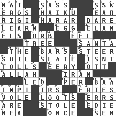 ACROSS 1. Floor covering 4. Backtalk 8. Compass dir. 11. Greek god of love 13. Japanese verse 15. Ewer handle 16. Swiss mountan, "Queen of the Mountains" 17. Ethiopian city, capital of Harari 18. Have the gumption 19. Memorize 21. Oval reproductive body of a fowl 22. Flair 23. Raised railways 24. Globe 27. Snakelike fish 29. Relationship diagram 30. Before Barbara or Clara 34. Definite Article 36. Soap units 39. Navigate 40. Earth 41. Schedule 43. Is not 44. For Whom the Bell _____ 46. Suggestive of the supernatural 47. Baseball player Mel 48. Assad's deity 49. SW Asia republic 51. Lion 53. For each 54. Sound made by sheep 57. Body of Kaffir warriors 60. Big collection agency 63. Strips of potato fried in deep fat 65. Grand slam 66. Plunders 69. Blunders 70. "We ___ not amused" (Victoria) 71. Fur scarf 72. Singer Brickell 73. Teachers' org. 74. At one time in the past 75. Elected rep. DOWN 1. Haggard of country music 2. Satellite of Uranus 3. Ancient Roman robes 4. Quiet! 5. American Automobile Association (abbr.) 6. Title for a man of rank and authority 7. Heroin 8. Lick closed 9. "Two Mules for Sister ____" 10. Songbird 12. Title for a knight 14. Goad 18. Accusation by an informer 20. Not either 25. Confederate soldiers (slang) 26. Calif. Air Force Base 28. Curvy letter 29. Copy Pinocchio 31. A home for chicks 32. Portable shelter 33. Tate display 34. Instrument 35. Land elevation 37. Actress Charlotte 38. Long narrow piece of something 40. R.R. building 42. Jane of fiction 45. A female animal or person 50. Sandy's bark 52. Petroleums 54. Avian creatures 55. Nest on high 56. NE Netherlands city 57. "Terrible" tsar 58. Greater amount 59. Entreaty 61. Printing process, for short 62. Within a short period 64. To sift 67. Affectionate concern, for short 68. Observe
