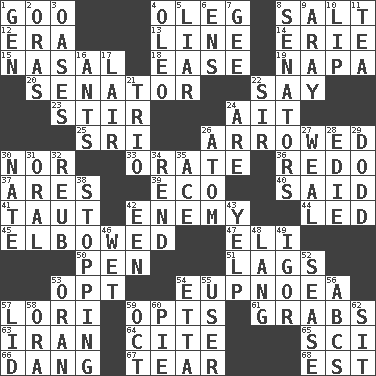 ACROSS 1. Thick or sticky substance 4. Cassini of fashion 8. Table seasoning 12. Period 13. Actor's bit 14. 4th largest of the Great Lakes 15. Relating to the nose 18. Relaxation 19. California wine valley 20. Legislator 22. Declare 23. Move through with a circular motion 24. Small island 25. _ Lanka 26. Moved like an arrow 30. Not either 33. Declaim 36. Redecorate 37. Ancient Greek god of war 39. Environmental prefix 40. Expressed in words 41. Drawn tight 42. Foe 44. Directed 45. Turned at an angle; bent 47. Connecticut Ivy Leaguer 50. Animal enclosure 51. Straggles 53. Elect 54. Normal relaxed breathing 57. Australian parrot (variant) 59. Chooses 61. Seizes 63. SW Asia republic 64. Quote 65. _-fi 66. Mild oath, euphamism for damn 67. Separate forcefully 68. Eastern Standard Time (abbr.) DOWN 1. Commissioned military rank (abbr.) 2. Mouths or openings 3. Fertile tracts in a desert 4. Margarine 5. One who doesn't tell the truth 6. Followers of ems 7. Turn to the right 8. Elected representatives 9. Like ___ of sunshine 10. Mouth edge 11. Afternoon social gathering 16. Pismires 17. Den 21. Musical group of three 22. Title for a knight 24. "We ___ not amused" (Victoria) 26. Tiny particle 27. Welt 28. Singer Brickell 29. Texas town _ City 30. Nathan's nickname 31. Of the mouth 32. Reuben's nickname 34. Tear apart 35. Adept person 38. Ceasing 42. Car or cant ending 43. Sharp bark 46. Soggy 48. Long (Scottish) 49. Composer Stravinsky 52. Gospel singer Marvin 53. NW Algerian seaport 54. Singer James 55. One who makes use of a thing 56. Lettered men learn these first 57. Hat (slang) 58. Mouth or opening 59. Sep. follower 60. Sliced dessert 62. Be seated