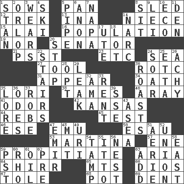ACROSS 1. Sty mamas 5. Baking dish 8. Downhill vehicle 12. Long journey 13. _ tizzy (2 wds.) 14. Sibling's daughter 15. Jai ____ 16. Census information 19. Not either 20. Elected representative 21. Inconspicuous attention getter 23. And so on (abbr.) 24. Ocean 27. Instrument 30. College mil. group 31. Become visible 34. Pledge 35. Australian parrot (variant) 38. Softens 40. Like ___ of sunshine 41. Aroma 42. Sunflower state 44. Confederate soldiers (slang) 45. Trial 46. Compass dir. 47. Australian flightless bird 50. Son of Isaac 53. Chrissie's court nemesis 57. Compass dir. 59. Conciliate 63. Operatic vocal solo 64. Bake eggs in their shells 65. Mountains (abbr.) 66. "Vaya con ____" 67. Lacquered or enameled metalware 68. Cooking vessel 69. Undesirable depression on a surface DOWN 1. Comedian Laurel of Laurel & Hardy 2. Lowest deck of a ship 3. Erodes 4. What Jean-Claude Killy likes to do 5. Corncob 6. Soon (poet.) 7. California wine valley 8. Be seated 9. Flowery wreath 10. Environmental prefix 11. Lair 14. Drug cop 17. Shoshoni 18. Car dealer's back yard 20. Discontinue 22. Flight of steps 24. Fly high 25. Singer James 26. Painful 28. Choose 29. Path through which fluid escapes 30. Exposes to great heat 32. Housemaid (var.) 33. Monthly bill 35. Old wives' tales, e.g. 36. Lyric poems 37. Loose flowing garment 39. Compass dir. 43. Toward the sea 47. Arab leader 48. Floor protector 49. RI univ. 51. Nest on high 52. The state of being joined or united 54. Pack (down) 55. "Tell ____ the Marines!" 56. A home for chicks 58. Compass direction 59. Pacific Standard Time (abbr.) 60. 17th letter of the Greek alphabet 61. Lubricate 62. Before (prefix) 63. Say or write further
