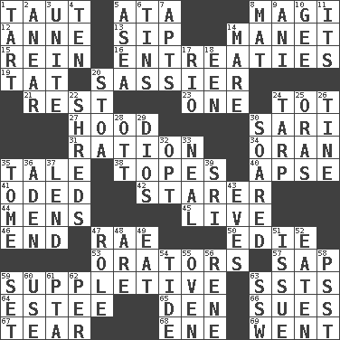 ACROSS 1. Drawn tight 5. "One Day ___ Time" 8. Wise men 12. Queen of England 1702-14 13. Small drink 14. French painter Edouard 15. It's straight from the horse's mouth 16. Pleas 19. Make lace 20. More lively and spirited 21. Relief 23. Single 24. Small child 27. Parka part 30. Indian skirt 31. Food allowance for one day 34. Northwest Algerian city 35. Story 38. Drinks excessively 40. Domed church section 41. Wrote a lyric poem 42. A viewer who gazes fixedly 44. Not women's 45. Not recorded 46. Conclusion 47. Actress Charlotte 50. Singer Brickell 53. Speakers 57. Plant excrement 59. Supplementary 63. Fast planes 64. First name in cosmetics 65. Lair 66. Takes to court 67. Pull into pieces 68. Compass dir. 69. Left DOWN 1. Small pie 2. Approach 3. Join together 4. "___ Little Indians" 5. Toward the sea 6. Metal containers 7. Flats, for short 8. Floor protector 9. Cuckoo 10. Turn to the right 11. ___ a Wonderful Life 14. Female horse 17. _ de Janeiro 18. Car or cant ending 20. Portico 22. Tears up 24. Canvas cover 25. Mouths or openings 26. Prong on a fork 28. Baseball player Mel 29. "Vaya con ____" 30. Flew 32. Choose 33. Anneal 35. Heavy book 36. An important port of Yemen 37. Grant temporary use of 39. Indian title of respect (Mr.) 43. Nights before holidays 47. Hero or heavy, e.g. 48. "We ___ not amused" (Victoria) 49. Consume 51. Come out of 52. Consumed 54. Periodic rise and fall of the sea level 55. Baking chamber 56. French philosopher Descartes 58. Inconspicuous attention getter 59. Put into a specified state 60. Purpose 61. Parent Teacher Association (abbr.) 62. For each 63. Compass dir.