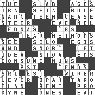 ACROSS 1. Third day of the wk. 4. Broad, flat, thick piece 8. Eras 12. Retirement account (abbr.) 13. Stalk of a moss capsule 14. Court order 15. Drug cop 17. Adolescent 18. Desist 19. Bull 21. Night before a holiday 23. Cartoonist voice _ Blanc 24. Ferber et al. 26. Big collection agency 28. Pull into pieces 30. Modes 34. Perceive with the eye 37. Grain storage tower 39. The front part of a cuirass 40. Added to 41. Derisive sound 43. Allow 44. The content of cognition 46. Portico 47. Begley and Asner 48. Eat 51. Religious women 54. Pacific Standard Time (abbr.) 55. Watches over 58. _ Lanka 61. Eastern Standard Time (abbr.) 63. One who wires 65. Crowbar 67. Brightly colored fish 71. Pacific island yam 72. Liveliness 73. Painter Guido (1575-1642) 74. Adept person 75. Unit of force 76. Singles 77. Ingest DOWN 1. Metal containers 2. A salt of uric acid 3. Having ears or earlike features 4. Fast jet (abbr.) 5. Area sheltered from the wind 6. Had dinner 7. Object of repulsion 8. "We ___ not amused" (Victoria) 9. Island territory of the United States 10. Otherwise 11. Stitch closed the eyes of (a falcon) 16. Penny 18. Sure thing 20. Actress Charlotte 22. Compete 25. Backtalk 27. A female animal or person 29. Remove soap 30. Person of subnormal intelligence 31. Stare 32. Passed on 33. Fast planes 34. Ketch in the Levant 35. Inside; within (prefix) 36. Genesis locale 38. Car dealer's back yard 42. Drawn tight 45. Viper 49. One who makes use of a thing 50. Mountains (abbr.) 52. ___ Haven, CT 53. In a ____ (agitated or irritated) 56. Window treatment 57. Father Junipero _ 58. Downhill vehicle 59. Have confidence or faith in 60. _ the terrible 62. "Corrida" creature 64. Carrot, for example 66. Compass dir. 68. Fenced enclosure 69. One (Scot) 70. Part of HMS, perhaps