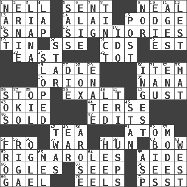 ACROSS 1. 1994 drama film starring Jodie Foster 5. Posted 9. Be tempered by heat 13. Operatic vocal solo 14. Mountain range southwest of Kyrgyzstan 15. Plash 16. Fastener 17. Seigniories (variant) 19. Shallow baking pan 20. Compass dir. 21. Music discs 22. Eastern Standard Time (abbr.) 23. 90 degrees 25. Small child 26. Dipping utensil 30. A distinct part 34. Constellation of myth 35. Grandmother 36. Constrict 39. Glorify 42. Abrupt rush of wind 43. Migrant worker of the '30s 44. Laconic 46. Exchanged or delivered for money 47. Proofreads 48. Beverage made from leaves 51. Tiny particle 54. Away 57. Armed conflict 58. Attila the _ 60. Ribbon knot 62. Frustrating wastes of time 65. Helper 66. Stares 67. Ooze 68. Perceives with the eye 69. Highlander 70. Snakelike fish 71. Inconspicuous attention getter DOWN 1. Political cartoonist Thomas 2. Bert's buddy 3. Climbing, woody, usually tropical vines 4. Pet locale 5. Backtalk 6. Writer Wiesel 7. Tired old horse 8. Colored lightly or faintly 9. Not either 10. Singer Brickell 11. Grows older 12. For fear that 15. Mail 18. Wedding promise 20. Play the lead 24. Slanted 27. Expire 28. Brine-cured salmon 29. Related on the mother's side 30. Consume 31. The 19th letter of the Greek alphabet 32. Followers of ems 33. Floor protector 36. Distress signal 37. Ring climax 38. Petroleum 40. Directed 41. Three (prefix) 45. Comedian Laurel of Laurel & Hardy 48. It was, poetically 49. Hearing organ 50. Came up 52. Off-Broadway awards 53. Methods 54. Toadlike animal 55. Capital of Latvia 56. Stare at amorously 58. Person who is morally reprehensible 59. United States Postal Service (abbr.) 61. Compass direction 63. Cartoonist voice _ Blanc 64. Area sheltered from the wind 65. Viper