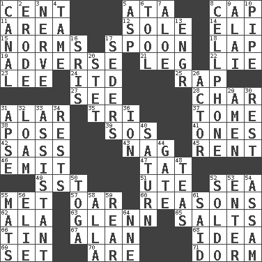 ACROSS 1. Penny 5. "One Day ___ Time" 8. Head covering 11. Type of rug 12. Not divided or shared with others 14. Biblical high priest 15. Typical standards 17. Soup utensil 18. Pet locale 19. Contrary to your interests or welfare 21. Part of a journey 22. Falsehood 23. Area sheltered from the wind 24. It would 25. Hit sharply and swiftly 27. Perceive with the eye 28. Burn to charcoal 31. Having or resembling wings 35. Three (prefix) 37. Heavy book 38. Introduce or present, as a question 39. Mayday 41. Singles 42. Backtalk 43. Tired old horse 45. Monthly bill 46. Give off 47. Make lace 49. Fast jet (abbr.) 51. Shoshoni 52. Ocean 55. Was introduced to 57. Rowing implement 60. Thinks logically 62. Chicken ___ king 63. American astronaut and politician John 65. Table seasonings 66. Metal container 67. Actor Alda or Thicke 68. It may be bright or harebrained 69. Arrange properly for use 70. "We ___ not amused" (Victoria) 71. Dormintory (informal) DOWN 1. Lessep's creation 2. Wear away 3. Boldness 4. Not wild 5. Viper 6. Implement 7. _ vera 8. Portable communications device 9. Jai ____ 10. Corncob 13. Engineer (abbr.) 16. Indian titles of respect 17. Spring feasts 20. Proofreading order 26. Thespian 29. So be it 30. State of inaction 31. Domed church section 32. Rich soil 33. Helper 34. Musical pauses 36. Electrically charged atom 40. Titan orbits this 44. Yard entry 48. Beverages made from leaves 50. Ancient Roman robe 52. Twentieth part of a lira 53. Keyboard key 54. Indian state 55. Floor protectors 56. Writer Wiesel 58. Silent film actress Nazimova 59. Located in or toward the back 61. Alleged 64. Compass dir.
