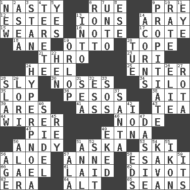 ACROSS 1. Characterized by obscenity 6. Sorrow 9. Before (prefix) 12. First name in cosmetics 13. Charged particles 14. Like ___ of sunshine 15. Erodes 16. Make mention of 17. ____ d'Azur (French Riviera) 18. One (Scot) 19. "Beetle Bailey" pooch 20. Drink excessively 21. Through, poetically 23. RI univ. 24. The bottom of a shoe or boot 25. Keyboard key 28. Secret 30. Olfactory organs 34. Grain storage tower 35. Trim (branches) 36. Mexican monetary units 38. Small island 39. Ancient Greek god of war 41. Slender Brazilian palm 43. Afternoon social gathering 44. One who wires 46. Connecting point 48. Sliced dessert 49. Inactive volcano in Sicily 50. "60 Minutes" Commentator Rooney 51. "____ silly question..." 53. What Jean-Claude Killy likes to do 56. Medicinal plant 57. Singer Murray 58. 1973 Nobel Price Winner (Physics) Leo 60. Highlander 61. Put down 62. A piece of turf (Scot.) 63. Epoch 64. Keyboard modifier key 65. Seines DOWN 1. ___ Haven, CT 2. Toward the sea 3. Comedian Laurel of Laurel & Hardy 4. Cigar-shaped 5. Consenting reply 6. Carrot, for example 7. To (old English) 8. Compass dir. 9. Conciliate 10. Pace 11. Sight organ 13. To the inside or interior of 14. Oak nuts 19. Fourth or lowest deck 20. Third day of the wk. 22. Layer 24. Abnormally rapid or deep breathing 26. Writer Wiesel 27. Round or rotation of duties 28. Cole _ (cabbage dish) 29. Australian parrot (variant) 31. Ocean 32. Curvy letter 33. Mayday 37. Before Barbara or Clara 40. A glass for beer 42. Electrically charged atom 45. Marina Del _, California 47. Small ungulate mammals of Africa 49. Supplemented with great effort 50. Having or resembling wings 51. Of or related to the anus 52. In a ____ (agitated or irritated) 54. Polynesian shrub of the pepper family 55. Image 56. Grow older 57. According to 58. Begley and Asner 59. ___ a Wonderful Life
