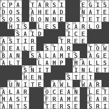ACROSS 1. Accounting whiz (abbr.) 4. Tarsus (plural) 9. The front part of a cuirass 13. Two (Sp.) 14. Toward the future 15. Nathan's nickname 16. Distress signal 17. Maid-servant 18. Wig 19. Part of HMS, perhaps 21. French article 22. Monte _, Las Vegas Hotel/Casino 24. Expressed in words 26. Frozen water 27. Moving about 29. Woody plant 30. Memphis, Tenn. Street 31. Play the lead 33. Pull behind 36. Bar 37. Deli grouping 40. Personal question 41. The first octave above the treble staff 42. Desk light 43. Shopping centers 45. In a ____ (agitated or irritated) 47. An arm off of a larger body of water 48. Layer 49. Proofreading order 50. Join together 52. Leather borer 54. Armed conflict 56. Having or resembling wings 57. Sea 59. Allow 61. Vertical spar for supporting sails 62. Movie unit 63. Ewer handle 64. Pismires 65. Laconic 66. _ Lanka DOWN 1. Music discs 2. "Silly old bear" 3. Aide 4. Keyboard key 5. Hold, grip (Informal) 6. French philosopher Descartes 7. Without 8. Binary compound 9. Main course 10. Highlander 11. "Tell ____ the Marines!" 12. Observe 20. Move on water 22. High-altitude cloud 23. Adept person 25. Angers 27. Swedish rock group 28. Lick closed 29. Pack (down) 31. Narrow board 32. Scottish cap 33. Baron Munchausen's specialties 34. Stare at amorously 35. Compass direction 38. Place in a line 39. Stricken, poetically 44. Afresh 45. Chest coverings 46. Remaining after all deductions 49. Criticizes harshly 50. ____ Bator, Mongolia 51. Political cartoonist Thomas 52. Measure of real estate 53. Put on (as clothing) 55. Bring up, as a child 56. Housemaid (var.) 57. Often (poetically) 58. Born 60. Three (prefix)
