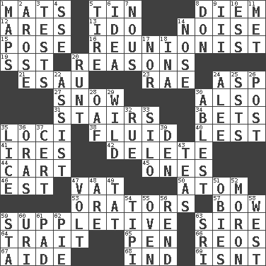 ACROSS 1. Floor protectors 5. Metal container 8. South Vietnam president (1954) 12. Ancient Greek god of war 13. Wedding promise 14. Annoying sound 15. Introduce or present, as a question 16. One who advocates reunion 19. Fast jet (abbr.) 20. Thinks logically 21. He sold his birthright 23. Actress Charlotte 24. Viper 27. Frozen precipitation 30. In addition 31. Flight of steps 34. Antes 35. Event scenes 38. Watery 40. For fear that 41. Angers 42. Keyboard key 44. Haul 45. Singles 46. Eastern Standard Time (abbr.) 47. Large container 50. Smallest unit of an element 53. Speakers 57. Arrow shooter 59. Supplying deficiencies 63. Father 64. Distinguishing feature 65. Writing instrument 66. Vintage cars 67. Assistant 68. Indiana (abbr.) 69. Is not DOWN 1. Atlas contents 2. Came up 3. Trials 4. Compass dir. 5. Become fatigued 6. The main thing one is thinking about 7. Horse sense 8. Spanish title 9. One more than two 10. Double-curved letter 11. Was introduced to 14. Sense of smell 17. And not 18. _ tizzy (2 wds.) 20. Undersized animal 22. Help 24. Toward shelter 25. Fast planes 26. Mail 28. Clumsy lout 29. Rampant 30. Most capable 32. Regret 33. Grain storage tower 35. Louse (plural) 36. Mouths or openings 37. Certainty 39. Lair 43. Afternoon social gatherings 47. Electrical Unit 48. "We ___ not amused" (Victoria) 49. Make lace 51. Off-Broadway awards 52. Person of subnormal intelligence 54. Native american tent (variation) 55. Baking chamber 56. Tear apart 58. Compass direction 59. R.R. building 60. RI univ. 61. Writing tablet 62. Sliced dessert 63. Indian title of respect (Mr.)