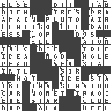 ACROSS 1. Otherwise 5. Baseball player Mel 8. Bar bill 11. South Vietnam president (1954) 12. Angers 14. Mouth or opening 15. At full speed 17. Mickey's pet 18. Atmosphere 19. Small, flat, pigmented spot on the skin 21. Snakelike fish 22. Pat or tap gently 23. Double-curved letter 24. Chop off 25. Two (Sp.) 27. Pipe bend 28. Smallest unit of an element 31. Baby powder 35. Expire 37. Lacquered or enameled metalware 38. The main thing one is thinking about 39. Allow head to fall sleepily 41. Hollow 42. Lightbulb-shaped fruit 43. Ocean 45. Narrow board 46. International (abbr.) 47. Title for a knight 49. Being at a high temperature 51. Binary compound 52. R.R. building 55. Mamie's husband 57. Retirement account (abbr.) 60. Legislator 62. 4-wheeled motor vehicle 63. Music written for nine 65. Resident of Iraq 66. Night before a holiday 67. Play the lead 68. A slight indication 69. June honoree 70. Wing 71. The bottom of a shoe or boot DOWN 1. Peak District village in England 2. Citrus fruits 3. Seines 4. Give off 5. Petroleum 6. Loyal 7. Wig 8. Inedible or poisonous agaric 9. Roberta Peters solo 10. Sharp remark 13. Disposed of to a purchaser 16. "Death on the ____" 17. Cotton for raincoats, e.g. 20. Precious metal 26. Curses 29. Rounded earthenware pot or jar 30. Confront 31. Native american tent (variation) 32. An important port of Yemen 33. Tough but pliablecoriaceous 34. Monte _, Las Vegas Hotel/Casino 36. Greek goddess of the dawn 40. Stop 44. Assistant 48. Painter Guido (1575-1642) 50. Airtight sealed metal containers 52. Showing deterioration from age 53. Woman's close-fitting hat 54. Satellite of Uranus 55. On the rocks 56. Polynesian shrub of the pepper family 58. Roll call or roster of names 59. Of or related to the anus 61. Bowlike part 64. Epoch