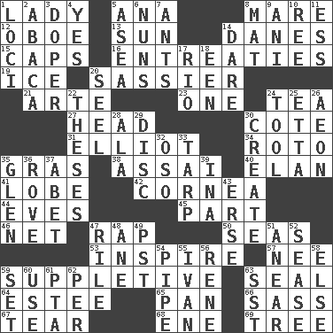 ACROSS 1. Kenny Rogers chart-topper in '80 5. Santa ___, CA 8. Female horse 12. Mitch Miller's instrument 13. Player for Phoenix 14. Natives or inhabitants of Denmark 15. Smile enhancers 16. Pleas 19. Frozen water 20. More disrespectful 21. Johnson of "Laugh-In" 23. Single 24. Afternoon social gathering 27. Froth on beer 30. ____ d'Azur (French Riviera) 31. American author Paul (1891-1958) 34. Printing process, for short 35. Pate de foie ____ 38. Slender Brazilian palm 40. Style 41. Ear part 42. Pupil covering 44. Nights before holidays 45. Role in a play 46. Fish or hair follower 47. Reproach for some lapse or misdeed 50. Oceans 53. Stimulate to action 57. Born 59. Supplying deficiencies 63. Lick closed 64. First name in cosmetics 65. Baking dish 66. Backtalk 67. Rend 68. Compass dir. 69. Relationship diagram DOWN 1. Event scenes 2. Phillipine bananalike plant 3. Drug addict 4. Affirmative reply 5. At sea 6. Religious women 7. Pismires 8. Floor protector 9. Cuckoo 10. To riddle 11. Double-curved letter 14. Have the gumption 17. River (Sp.) 18. Car or cant ending 20. Stitch closed the eyes of (a falcon) 22. College papers 24. Implement 25. Singer James 26. Period of immesurable duration 28. Chicken ___ king 29. Compact _ 30. Make 32. Bear (Spanish) 33. Canvas cover 35. Small, secluded valley 36. Be footloose 37. Collude with 39. _ tizzy (2 wds.) 43. Celtic language 47. Cause heat under the collar 48. A saturated hydrocarbon 49. Pacific Standard Time (abbr.) 51. Approach 52. Gospel singer Marvin 54. Corncob 55. "Terrible" tsar 56. French philosopher Descartes 58. Otherwise 59. Put into a specified state 60. Purpose 61. Parent Teacher Assoc. 62. For each 63. Fast jet (abbr.)