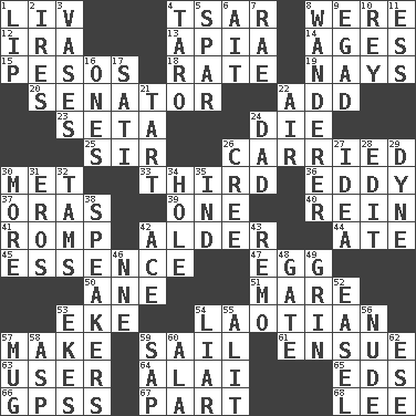 ACROSS 1. 54 in ancient Rome 4. Russian ruler of old 8. We are 12. Lyricist Gershwin 13. Capital of Western Samoa 14. Eons 15. Mexican monetary units 18. Pace 19. Negative votes 20. Legislator 22. Say or write further 23. Bristle 24. Pass on 25. Title for a knight 26. Borne 30. Was introduced to 33. One of three equal parts 36. Whirlpool 37. Mouths or openings 39. Single 40. It's straight from the horse's mouth 41. Frolic 42. Tree or shrub in the Birch family 44. Had dinner 45. Gist 47. Ovum 50. One (Scot) 51. Female horse 53. Make supply last 54. Of or relating to Laos or its people 57. Cause to be 59. Move on water 61. Follow as a consequence or result 63. One who uses or employs something 64. Jai _ 65. Begley and Asner 66. Global Positioning Systems (abbr.) 67. Piece 68. Area sheltered from the wind DOWN 1. Mouth edge 2. Angers 3. Flower holders 4. Pacific island yam 5. Practice fight 6. Small island 7. Actress Charlotte 8. Roamer 9. Mild oath 10. Marina Del _, California 11. Double-curved letter 16. Washington bills 17. Suttee (variant) 21. Small pie 22. Atmosphere 24. Male parent 26. Algonquian 27. The content of cognition 28. Prepare for publication 29. Unit of force 30. Greater amount 31. Greek god of love 32. Scottish caps 34. Opening into or through something 35. Working for oneself (abbr.) 38. Orators 42. Adept person 43. San ____ (Riviera town) 46. Compass dir. 48. Yard entry 49. Amused look 52. Artist's stand 53. Makes supply last 54. One who doesn't tell the truth 55. Set down 56. Unadorned 57. Java container 58. Cleo's killer 59. Plant excrement 60. Chicken ___ king 62. Compass dir.