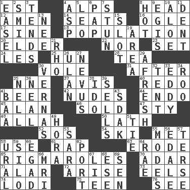 ACROSS 1. Eastern Standard Time (abbr.) 4. High mountains 8. Froth on beer 12. So be it 14. Theater features 16. Stare at amorously 17. Trig term 18. Census information 20. A person who is older than you are 22. Not either 23. Arrange properly for use 24. French article 25. Attila the _ 28. Beverage made from leaves 30. Short-tailed, large-bodied rat 31. Following 35. Compass dir. 37. Opinion 40. Make new 41. Fermented drink made from hops 42. Unclothed pictures 44. Inside; within (prefix) 45. Actor Alda or Thicke 46. Disposed of to a purchaser 47. Filthy place 48. Assad's deity 50. Thin strip of wood or metal 52. Mayday 54. What Jean-Claude Killy likes to do 55. Was introduced to 58. Purpose 61. Strike 63. Wear away 65. Complicated, petty procedures 70. The sixth month of the Jewish calendar 71. Having or resembling wings 72. Get up 73. Snakelike fish 74. Farming town in central California 75. Adolescent 76. Perceive with the eye DOWN 1. Artist's stand 2. Grin 3. Looks after 4. Viper 5. Lion 6. Infant food 7. Surprise greatly 8. Being at a high temperature 9. Armor plate that protects the chest 10. Medicinal plant 11. Undesirable depression on a surface 13. Born 15. Narrow, elongated depression 19. Type of rug 21. 17th letter of the Greek alphabet 26. ____ Bator 27. Congenital growth or mark on the skin 29. Anew 30. Actresses Bloom and Felton 32. Portable shelter 33. Whirlpool 34. Friend of Pooh 35. 1994 drama film starring Jodie Foster 36. Be tempered by heat 38. Wedding promise 39. Exchanges for money 41. Sound made by sheep 43. Neighbor of Neb. 49. Israeli folk dance 51. Make a knot 53. "Two Mules for Sister ____" 55. Methods 56. Peak District village in England 57. Laconic 58. Mountain range 59. Grain storage tower 60. Mild oath 62. Left side of a ship or aircraft 64. Actress Charlotte 66. Medical imaging device (abbr.) 67. Falsehood 68. Compass dir. 69. Elected rep.