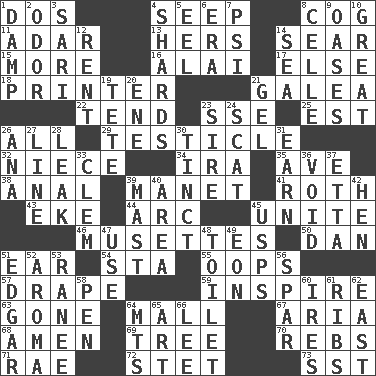 ACROSS 1. Two (Sp.) 4. Ooze 8. Gear tooth 11. The sixth month of the Jewish calendar 13. Possessive pronoun 14. Scorch 15. Greater amount 16. Jai _ 17. Otherwise 18. Hard copy producer 21. An organ shaped like a helmet 22. Be inclined (to) 23. Compass dir. 25. Eastern Standard Time (abbr.) 26. 100% 29. One of the two male reproductive glands 32. Sibling's daughter 34. Retirement account (abbr.) 35. "___ Maria" 38. Of or related to the anus 39. French painter Edouard 41. Writer of Portnoy's Complaint (1969) 43. Make supply last 44. Curve 45. Join together 46. French bagpipes 50. Daniel's nick name 51. Hearing organ 54. R.R. building 55. I made a mistake 57. Window treatment 59. Heighten or intensify 63. Went 64. Shopping center 67. Roberta Peters solo 68. So be it 69. Family _ (genealogy) 70. Confederate soldiers (slang) 71. Actress Charlotte 72. Proofreading order 73. Fast jet (abbr.) DOWN 1. Moist 2. Scent 3. Indian skirt 4. Pottery fragments 5. Snakelike fish 6. Period 7. Air pressure measure (abbr.) 8. Cell (Danish) 9. Fertile tracts in a desert 10. Relatively large 12. Monthly bill 14. Ocean 19. Wig 20. Compass dir. 21. Set 23. The founder of a family 24. Scram! 26. Santa ___, CA 27. Actor's bit 28. Path through which fluid escapes 30. A color or tint 31. Merit 33. Clement's nick name 36. Nothingness 37. Singer James 39. Vertical spar for supporting sails 40. Type of rug 42. Layer 45. United States Postal Service (abbr.) 47. Purpose 48. Rest room 49. A really long time 51. _ Allan Poe 52. Odor 53. Indian princess (variant) 56. Practice fight 58. Animal enclosure 60. Angers 61. Teases 62. Compass direction 64. Mountains (abbr.) 65. Tate display 66. Area sheltered from the wind