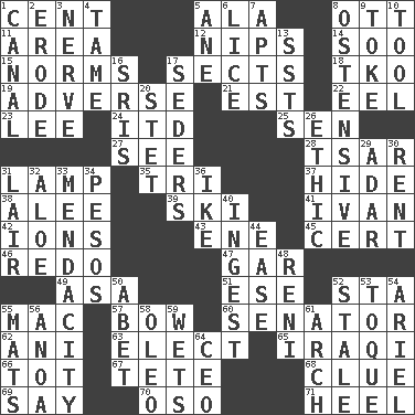 ACROSS 1. Penny 5. Wing 8. Baseball player Mel 11. Type of rug 12. Cuts off 14. "Barney Miller" actor Jack 15. Typical standards 17. Religious groups 18. Ring climax 19. Contrary to your interests or welfare 21. Eastern Standard Time (abbr.) 22. Snakelike fish 23. Area sheltered from the wind 24. It would 25. Elected rep. 27. Perceive with the eye 28. Russian ruler of old 31. Desk light 35. Three (prefix) 37. Flintstone garb 38. Toward shelter 39. What Jean-Claude Killy likes to do 41. _ the terrible 42. Charged atoms 43. Compass dir. 45. Foregone conclusion 46. Redecorate 47. Slender fish 49. White ___ sheet 51. Compass dir. 52. R.R. building 55. Apple computer (short form) 57. Arrow shooter 60. Elected representative 62. Black tropical American cuckoo 63. Choose 65. Resident of Iraq 66. Small child 67. Wig 68. A slight indication 69. Declare 70. Bear (Spanish) 71. Person who is morally reprehensible DOWN 1. Lessep's creation 2. Wear away 3. Boldness 4. Docile 5. One (Scot) 6. Louse (plural) 7. Flats, for short 8. Clearly or manifestly demonstrative 9. Casino tip 10. Instrument 13. Fast planes 16. Indian titles of respect 17. Spring feasts 20. Proofreading order 26. Principle of right and wrong 29. The sixth month of the Jewish calendar 30. Monthly bill 31. Den 32. Medicinal plant 33. Ananias' fault 34. Mexican monetary units 36. D.D.E's nickname 40. Consume 44. Relaxation 48. Painter Guido (1575-1642) 50. Collude with 52. Showing deterioration from age 53. Woman's close-fitting hat 54. Satellite of Uranus 55. Floor coverings 56. Small Philippine buffalo 58. Margarine 59. Soaks 61. Bowlike part 64. Corporate head (abbr.)