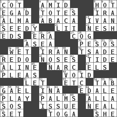 ACROSS 1. Small bed 4. Among 8. Being at a high temperature 11. Mild oath 13. Hauls 15. Lyricist Gershwin 16. _ mater 17. Phillipine bananalike plant 18. "Terrible" tsar 19. Shabby and untidy 21. Cards in a Roman deck? 22. Tender 23. Begley and Asner 24. Period 27. Gear tooth 29. At sea 30. Mexican monetary units 34. Dripping 36. SW Asia republic 39. Sadhe (variant) 40. Do over again 41. Olfactory organs 43. Event that recurs at intervals 44. Place in a line 46. Drug cop 47. Raised railways 48. Entreaties 49. Empty area or space 51. Allow 53. And so on (abbr.) 54. Bar bill 57. Highlander 60. _ tizzy (2 wds.) 63. Peak District village in England 65. Shaw product 66. Insides of hands 69. Silent film actress Nazimova 70. Mayday 71. Come out of 72. Anneal 73. Put into a specified state 74. Ancient Roman robe 75. A female animal or person DOWN 1. Desist 2. Stared at amorously 3. Corrects by punishment or discipline 4. "One Day ___ Time" 5. Crowd into 6. Slanted text style (abbr.) 7. Tenth: prefix 8. Hub of activity 9. Mouths or openings 10. Hyperbolic tangent 12. Male parent 14. Ketch in the Levant 18. Consumed 20. Affirmative reply 25. It's straight from the horse's mouth 26. Composer Copland 28. Choose 29. Lacking a tonal center or key 31. Travel by water 32. Likelihood 33. Perceive with the eye 34. Not ill 35. Singer Brickell 37. White ___ sheet 38. Impudent aggressiveness 40. Strike 42. Native of Scotland 45. Compass dir. 50. Frozen water 52. Native american tent (variation) 54. Lies 55. Assad's deity 56. Calif. Air Force Base 57. Global Positioning Systems (abbr.) 58. _ vera 59. 90 degrees 61. Political cartoonist Thomas 62. In addition 64. One of the 12 tribes of Israel 67. Large cup 68. Ocean