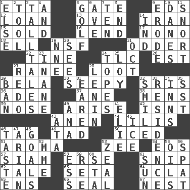 ACROSS 1. Singer James 5. Yard entry 9. Begley and Asner 12. Grant temporary use of 13. Baking chamber 14. SW Asia republic 15. Disposed of to a purchaser 16. Grant temporary use of 17. Words to Nanette 18. Pipe bend 19. Overdraft (abbr.) 21. More peculiar 22. Prong on a fork 24. Affectionate concern, for short 26. Eastern Standard Time (abbr.) 27. The wife of a rajah (variant) 28. Spoils 29. Actor Lugosi 30. Not well drained, as in land 32. Indian titles of respect 36. Arabian gulf 37. One (Scot) 38. Not women's 39. Olfactory organ 40. Ascend 42. Is not 43. So be it 44. Ms. Damita and namesakes 46. Label 49. Small amount or degree 50. On the rocks 51. Odor 53. Last letter of the English alphabet 54. Greek goddess of the dawn 57. Thailand, formerly 58. Celtic language 61. Sever or remove by pinching or nipping 62. Story 63. Bristle 64. Southern CA. univ. 65. Followers of ems 66. Lick closed 67. Egg locale DOWN 1. Otherwise 2. Utensil 3. Baron Munchausen's specialties 4. Added to 5. _ course 6. "___ Maria" 7. Nine, plus one 8. Conclusion 9. Wear away 10. Natives or inhabitants of Denmark 11. Derisive sound 14. Indiana (abbr.) 19. Compass dir. 20. Observes 21. Sep. follower 23. Empty; void 24. Drinks excessively 25. Myrna of the movies 27. Make new 28. Soviet premier 1918-24 29. Prohibit 31. Having ears or earlike features 32. Grin 33. Home 34. Restaurants 35. Fast jet (abbr.) 40. Nanny (var.) 41. Writer Wiesel 43. _ moment's notice (2 wds.) 45. Frozen water 46. Clothes sense 47. Believer in; advocate of (suffix) 48. Finish lines 52. Madame (abbr.) 53. Ardor 55. Lubricates 56. Petty quarrel 58. Double-curved letter 59. To sift 60. R.R. building 61. Player for Phoenix