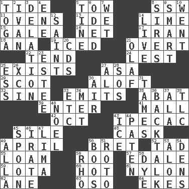 ACROSS 1. Event that recurs at intervals 5. Pull behind 8. Compass dir. 11. Baking chambers 13. Binary compound 14. Citrus frut 15. An organ shaped like a helmet 16. Remaining after all deductions 17. SW Asia republic 18. Santa ___, CA 19. On the rocks 21. Unconcealed 22. Look after 24. For fear that 25. Is 27. White ___ sheet 29. Highlander 30. High up in or into the air 32. Trig term 33. Sends forth 35. Blind as ____ 39. Keyboard key 41. Promenade 42. Sep. follower 43. Medicinal drug used to evoke vomiting 45. Filth; sediment 48. Keg 49. Showery time 50. Cy Young winner Saberhagen 52. Small amount or degree 55. Rich soil 56. Friend of Pooh 57. Peak District village in England 59. Globular water bottle used in Asia 60. Being at a high temperature 61. Thermoplastic polyamide 62. A saturated hydrocarbon 63. Bear (Spanish) 64. Supplements with great effort DOWN 1. Ancient Roman robe 2. _ the terrible 3. Conveyance 4. Compass dir. 5. Prong on a fork 6. Wrote a lyric poem 7. Dripping 8. Titles for men of rank and authority 9. Don Adams' spy role 10. Gone 12. Virtuous person 14. Not recorded 20. Music discs 21. Norwegian king 23. First name in cosmetics 25. Curvy letter 26. One more than ninety 27. Keyboard modifier key 28. Distress signal 30. Wind 31. Makes less strong or intense 33. And so on (abbr.) 34. Was introduced to 36. Sass 37. According to 38. Affectionate concern, for short 40. Christmas carol 43. Frozen water 44. Eucharist need 45. Soup utensil 46. Feeling or showing extreme anger 47. Pale green bean 49. Silent film actress Nazimova 50. Expressions of contempt or scorn 51. Printing process, for short 53. _ vera 54. Hiding places for outlaws 56. 17th letter of the Greek alphabet 58. Color