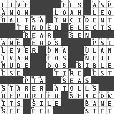 ACROSS 1. Moving, as bait 5. Raised railways 8. Viper 11. Soon (poet.) 12. Rich soil 13. Lion 14. Greek mezzo-soprano Agnes 17. Event 19. Watched over 21. Chooses 22. Stern 23. Elected rep. 24. A saturated hydrocarbon 27. Greek god of love 29. Air pressure measure (abbr.) 32. Crowbar 34. Heredity factor (abbr.) 36. Uhlan (variant) 37. "Terrible" tsar 38. Greek goddess of the dawn 39. Famous astronaut Armstrong 40. Naked 41. Two (Sp.) 42. Instruction Manual for Humans 43. Compass dir. 44. Become fatigued 46. Eastern Standard Time (abbr.) 47. Parent Teacher Association (abbr.) 50. Oceans 52. A viewer who gazes fixedly 55. Ringlike coral islands and reefs 57. Newsperson 59. Manatee 62. ___ a Wonderful Life 63. Drop; flow; fall 64. Object of repulsion 65. Perceive with the eye 66. Snakelike fish 67. Proofreading order DOWN 1. Experiment locale 2. _ tizzy (2 wds.) 3. Electrical Unit 4. Keyboard key 5. Period of immesurable duration 6. Shoestrings 7. Grin 8. Actor Baldwin 9. Emitted 10. Plant holders 12. Flaplike covering 15. Contemptuous expression 16. The sixth month of the Jewish calendar 18. Lair 20. Eaten away 24. Place in a line 25. Mole, birthmark 26. Elude 28. Snob 29. Cadet 30. Travels by water 31. An arm off of a larger body of water 33. Compass dir. 35. Aid 36. Corn or form start 42. Calif. Air Force Base 45. Vintage cars 47. Adept person 48. Laconic 49. Nick name for Arthur 51. Thick slices 52. Indian titles of respect 53. Wig 54. Domed church section 55. "We ___ not amused" (Victoria) 56. Scram, to a cat 58. Pipe bend 60. Single 61. Dripping
