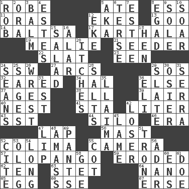 ACROSS 1. Loose flowing garment 5. Had dinner 8. Double-curved letter 11. Mouths or openings 12. Supplements with great effort 13. Thick or sticky substance 14. Greek mezzo-soprano Agnes 17. Volcano in Comoros 19. Ear of corn 21. Sowing specialist 22. Narrow board 23. Car or cant ending 24. Compass dir. 27. Arches 29. Distress signal 32. Having ears or earlike features 34. Actor Linden 36. Otherwise 37. Ripens 38. Pipe bend 39. Den 40. A home for chicks 41. R.R. building 42. 61 cubic inches 43. Fast jet (abbr.) 44. Grain storage tower 46. Epoch 47. Pet locale 50. Vertical spar for supporting sails 52. Volcano in Mexico 55. Device for capturing images 57. Volcano in El Salvador 59. Eaten away 62. Nine, plus one 63. Proofreading order 64. Billionth: prefix 65. Oval reproductive body of a fowl 66. Compass dir. 67. Celtic language DOWN 1. Director Reiner 2. Mouth or opening 3. Lip ointment 4. _____ Park, CO 5. Alias (abbr.) 6. Laconic 7. First name in cosmetics 8. Mild oath 9. Flatfish 10. Fly high 12. Supplement with great effort 15. First course 16. Having or resembling wings 18. Layer 20. Strong, restless desires 24. Seines 25. Gurus 26. Obtain by seizing forcibly or violently 28. Table seasonings 29. Schedule 30. Flexible twig of a willow tree 31. Spanish missionary in California 33. Eastern Standard Time (abbr.) 35. Volcano in Chile 36. Connecticut Ivy Leaguer 42. Failure 45. Unable to walk 47. Mouth edge 48. Collect or gather 49. Leg coverings 51. Heavy duty weighing machine 52. Quote 53. Cassini of fashion 54. Yearn 55. Small bed 56. The sixth month of the Jewish calendar 58. Turn to the right 60. Followers of ems 61. A female stoat