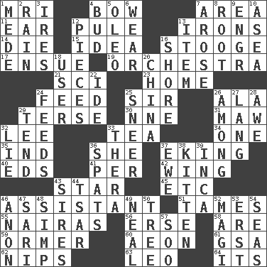 ACROSS 1. Medical imaging device (abbr.) 4. Arrow shooter 7. Length times width 11. Hearing organ 12. Whimper 13. Metal shackles 14. Expire 15. The main thing one is thinking about 16. Moe Howard, for one 17. Take place subsequently 19. A group of crickets 21. _-fi 23. Dwelling 24. Nourish 25. Title for a knight 26. According to 29. Laconic 30. Compass dir. 31. Opening into something insatiable 32. Area sheltered from the wind 33. Afternoon social gathering 34. Single 35. Indiana (abbr.) 36. A female animal or person 37. Supplementing with great effort 40. Begley and Asner 41. For each 42. A group of plovers 43. Play the lead 45. And so on (abbr.) 46. Helper 51. Corrects by punishment or discipline 55. Monetary units of Nigeria 56. Celtic language 58. "We ___ not amused" (Victoria) 59. Abalone 60. Period of immesurable duration 61. Girls' org. (abbr.) 62. Pinches, bites 63. Lion 64. It is DOWN 1. Ancient Persian 2. Water falling in drops from the sky 3. Angers 4. Partially opened flower 5. Butter sub 6. Erode 7. Came up 8. Carrot, for example 9. Engineer (abbr.) 10. Toward the sea 12. Parts 13. Detail 16. Dinah or Pauly 18. One who makes use of a thing 20. Large country 22. Binary compound 24. Eats 25. Contemptuous expression 26. Amid 27. Long (Scottish) 28. Deep reverence 29. Look after 32. Whopper 33. Volcano in Greece 36. Arguments over trivial matters 37. She-sheep 38. Baby cat 39. South American Indian 43. Begets 44. Russian ruler of old 46. Soon (poet.) 47. Indian skirt 48. Simple or foolish person 49. Be tempered by heat 50. Relationship diagram 52. Wise men 53. A group of bees 54. Oceans 57. "Barney Miller" actor Jack