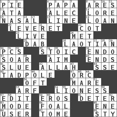 ACROSS 1. Sliced dessert 4. Dad 8. Ancient Greek god of war 12. _ moment's notice (2 wds.) 13. Actor Baldwin 14. Old wives' tales, e.g. 15. Relating to the nose 18. Actor's bit 19. Grant temporary use of 20. A young rabbit 22. Small bed 23. Not recorded 24. Was introduced to 25. Apply (a substance) by light strokes 26. Of or relating to Laos or its people 30. Personal Computers (abbr.) 33. Unemotional 36. Inside; within (prefix) 37. Fly high 39. Direct toward a target or goal 40. Extremities 41. Turn sharply 42. Assad's deity 44. Compass dir. 45. A young frog 47. The grampus (Milton) 50. Often (poetically) 51. Female horse 53. Sandy's bark 54. A female lion 57. Prepare for publication 59. Greek god of love 61. Prevent from occurring 63. Method 64. A young horse 65. Compass dir. 66. One who makes use of a thing 67. Heavy book 68. Filthy place DOWN 1. Baking dish 2. Slanted text style (abbr.) 3. Artist's stand 4. Diluted with white 5. Set down 6. Animal enclosure 7. Adept person 8. One to whom something is allotted 9. Carrot, for example 10. Period 11. Elected rep. 16. Enthusiastic 17. Monetary unit of Bulgaria 21. Confederate soldiers (slang) 22. Corporate head (abbr.) 24. Big _ 26. Pale green bean 27. Lodging establishments 28. Sums up 29. Sense of smell 30. Inconspicuous attention getter 31. Root beer relative 32. Saudi Arabian king (1953-1964) 34. Story 35. Lubricate 38. News announcer 42. Keyboard modifier key 43. Same (prefix) 46. No longer planned or scheduled 48. Monetary unit of South Africa 49. Algonquian 52. _____ Park, CO 53. Assistant 54. Rich soil 55. Capri or Wight 56. Emitted 57. Australian flightless bird 58. Two (Sp.) 59. Bank Draft (abbr.) 60. Friend of Pooh 62. Marina Del _, California