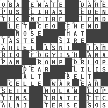 ACROSS 1. Chief or king in Benin or Nigeria 4. Related on the mother's side 9. Have the gumption 13. Product of festering 14. Monetary units of Turkey 15. Genesis locale 16. Affectionate concern, for short 17. Distance measurement (Brit.) 18. Grant temporary use of 19. Allow 21. Corporate head (abbr.) 22. Make improvements or corrections to 24. Olfactory organ 26. Floor protector 27. Clothes sense 29. Beget 30. Satellite of Uranus 31. Is not 33. Scottish cap 36. _ de Janeiro 37. Out of fashion; old fashioned 40. Nanny (var.) 41. Baking dish 42. Frolic 43. Fourth or lowest deck 45. Letter starter 47. Ms. Damita and namesakes 48. The first octave above the treble staff 49. Waist strap 50. Cell (Danish) 52. Armed conflict 54. Hearing organ 56. Bristle 57. Pitcher Ryan 59. Chop off 61. Canisters 62. Feeling or showing extreme anger 63. And so on (abbr.) 64. Jai _ 65. Laconic 66. Distress signal DOWN 1. Choose 2. A male whale 3. A group of larks 4. Shade tree 5. Sibling's daughter 6. Johnson of "Laugh-In" 7. Pacific island yam 8. Compass dir. 9. Keyboard key 10. An important port of Yemen 11. Tear apart 12. Conclusion 20. Carryall 22. Sends forth 23. Make imperfect 25. Automatically 27. Canvas cover 28. Operatic vocal solo 29. Sever or remove by pinching or nipping 31. Composer Stravinsky 32. Symbol (abbr.) 33. Baron Munchausen's specialties 34. Mine, in Marseilles 35. Atlas contents 38. Speak pompously 39. Opening into or through something 44. Cause heat under the collar 45. Monetary unit of Gambia 46. Pipe bend 49. Naughty children 50. To provide with a ceiling 51. Inactive volcano in Sicily 52. Had on 53. Having or resembling wings 55. Printing process, for short 56. R.R. building 57. A young louse 58. Born 60. Personal Computers (abbr.)