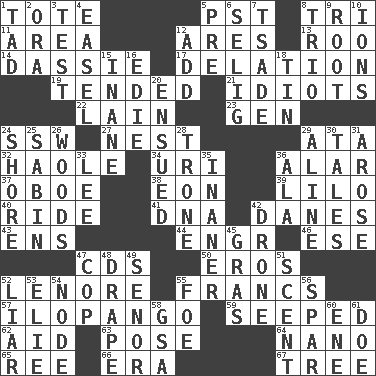 ACROSS 1. Carry 5. Pacific Standard Time (abbr.) 8. Three (prefix) 11. Length times width 12. Ancient Greek god of war 13. Friend of Pooh 14. Small ungulate mammals of Africa 17. Accusation by an informer 19. Watched over 21. Foolish or stupid persons 22. (Had) reclined 23. Commissioned mil. rank 24. Compass dir. 27. Egg locale 29. _ moment's notice (2 wds.) 32. White Person, in Hawaii 34. RI univ. 36. Having or resembling wings 37. Mitch Miller's instrument 38. A really long time 39. _ and Stitch 40. Travel on an animal 41. Heredity factor (abbr.) 42. Natives or inhabitants of Denmark 43. Followers of ems 44. Engineer (abbr.) 46. Compass dir. 47. Music discs 50. Greek god of love 52. Poe poem 55. Monetary units of Congo 57. Volcano in El Salvador 59. Oozed 62. Assist 63. Introduce or present, as a question 64. Billionth: prefix 65. To riddle 66. Period 67. Woody plant DOWN 1. Small amount or degree 2. Mouth or opening 3. Trial 4. Artist's stand 5. Before (prefix) 6. Former Milwaukee Brewers owner Bud 7. Sadhe (variant) 8. Musical group of three 9. Carrot, for example 10. Charged atoms 12. Find the sum of 15. Lacking in sense or substance 16. Singer Brickell 18. Shallow baking pan 20. Followed as a consequence or result 24. Dinah or Pauly 25. Unit of acoustic absorption 26. Forest 28. Heavy duty weighing machine 29. Place in a line 30. Stories 31. Came up 33. Area sheltered from the wind 35. More lacking in sense or substance 36. Chicken ___ king 42. A male bee 45. Pate de foie ____ 47. Police officer (slang) 48. Window treatment 49. Sir (Sp.) 51. Aroma 52. One who doesn't tell the truth 53. Writer Wiesel 54. Thickened enlargement 55. Enemy 56. Coast Guard woman 58. Girls' org. (abbr.) 60. Compass dir. 61. A female springbok