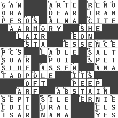 ACROSS 1. Separate the seeds from cotton 4. Johnson of "Laugh-In" 8. San ____ (Riviera town) 12. Mouth or opening 13. Letter starter 14. SW Asia republic 15. Mexican monetary units 18. _ mater 19. Quote 20. A group of aardvarks 22. A female animal or person 23. Den 24. A really long time 25. R.R. building 26. Substance 30. Personal Computers (abbr.) 33. Dipping utensil 36. Table seasoning 37. Fly high 39. Luau course 40. A young barracuda 41. Change direction abruptly 42. NE Netherlands city 44. Nursemaid (var.) 45. A young toad 47. It is 50. Often (poetically) 51. A group of chickens 53. Sandy's bark 54. Choose not to consume 57. Back-to-school mo. 59. Drop; flow; fall 61. Bert's buddy 63. Singer Brickell 64. Mountain range 65. Raised railways 66. Russian ruler of old 67. Grandmother 68. It is so DOWN 1. Republican Party 2. Length times width 3. Rhinal 4. The sixth month of the Jewish calendar 5. Depend 6. Scottish cap 7. Epoch 8. A group of martens 9. One of the Great Lakes 10. Floor covering 11. Single 16. Mouths or openings 17. Stricken, poetically 21. Taken by mouth 22. Distress signal 24. Compass dir. 26. Writer Wiesel 27. California wine valley 28. Clement's nick name 29. Singer James 30. Inconspicuous attention getter 31. Root beer relative 32. Saudi Arabian king (1953-1964) 34. Domed church section 35. Two (Sp.) 38. News announcer 42. The first octave above the treble staff 43. Pinches, bites 46. Not in operation 48. Wig 49. Shrivel 52. Abounding in pines 53. Capital of Western Samoa 54. Actor Alda or Thicke 55. Actor Lugosi 56. "Death on the ____" 57. Put into a specified state 58. Begley and Asner 59. Player for Phoenix 60. Retirement account (abbr.) 62. Double-curved letter