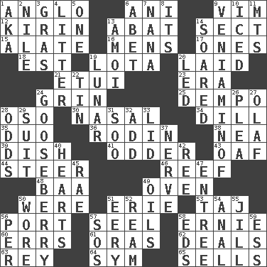 ACROSS 1. White American of non-Hispanic descent 6. Cuckoo 9. Zeal 12. Japanese brewing company 13. Blind as ____ 14. Religious group 15. Having winglike extensions 16. Not women's 17. Washington bills 18. Eastern Standard Time (abbr.) 19. Globular water bottle used in Asia 20. Put down 21. Needle case 23. Period 24. Broad smile 25. Volcano in Sumatra 28. Bear (Spanish) 30. Rhinal 34. Deli pickle 35. Superhero pair 36. "The Thinker" sculptor 38. Teachers' org. 39. Food container 41. More peculiar 43. Clumsy lout 44. Bull 46. Coral ridge 48. Sound made by sheep 49. Baking chamber 50. Past tense of be (plural) 51. One of the Great Lakes 53. _ Mahal 56. Left side of a ship or aircraft 57. Sew up the eyelids of hawks and falcons 58. Bert's buddy 60. Blunders 61. Mouths or openings 62. Allots cards 63. Marina Del _, California 64. Symbol (abbr.) 65. Makes a sale DOWN 1. Alias (abbr.) 2. "Death on the ____" 3. Pate de foie ____ 4. A group of domestic dogs 5. Single 6. Collude with 7. Grandmother 8. It is 9. Volcano in U.S.A. 10. On the rocks 11. Mountains (abbr.) 13. Mine, in Marseilles 14. Flew 19. Type of eclipse 20. Directed 22. Metal container 24. Sour, prickly fruit 26. Entreaty 27. Norwegian king 28. Likelihood 29. Costume for a special activity 31. "Barney Miller" actor Jack 32. Find the sum of 33. Hat (slang) 37. Boldness 40. Centers 42. To riddle 45. Actress Charlotte 47. Main course 49. Lubricates 50. Had on 51. Suggestive of the supernatural 52. 480, 500 or 516 sheets of paper 54. Of or related to the anus 55. A female wallaby 56. For each 57. Mayday 58. Begley and Asner 59. Curvy letter